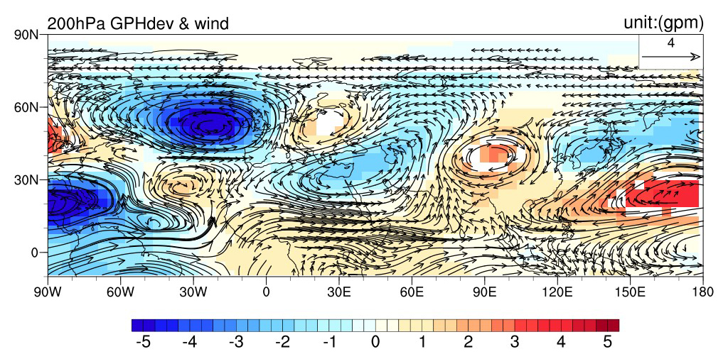图3.新仙女木时期TraCE 21ka淡水强迫模拟200hPa 位势高度纬向偏差(填色)及风场(矢量箭头)的变化。