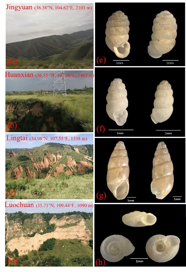 图1. 黄土高原采样点的自然景观和植被照片(a-d),Pupilla aeoli (e)、Gastrocopta armigerella (f)、Opeas striatissimum (g)、 Vallonia tenera (h)。