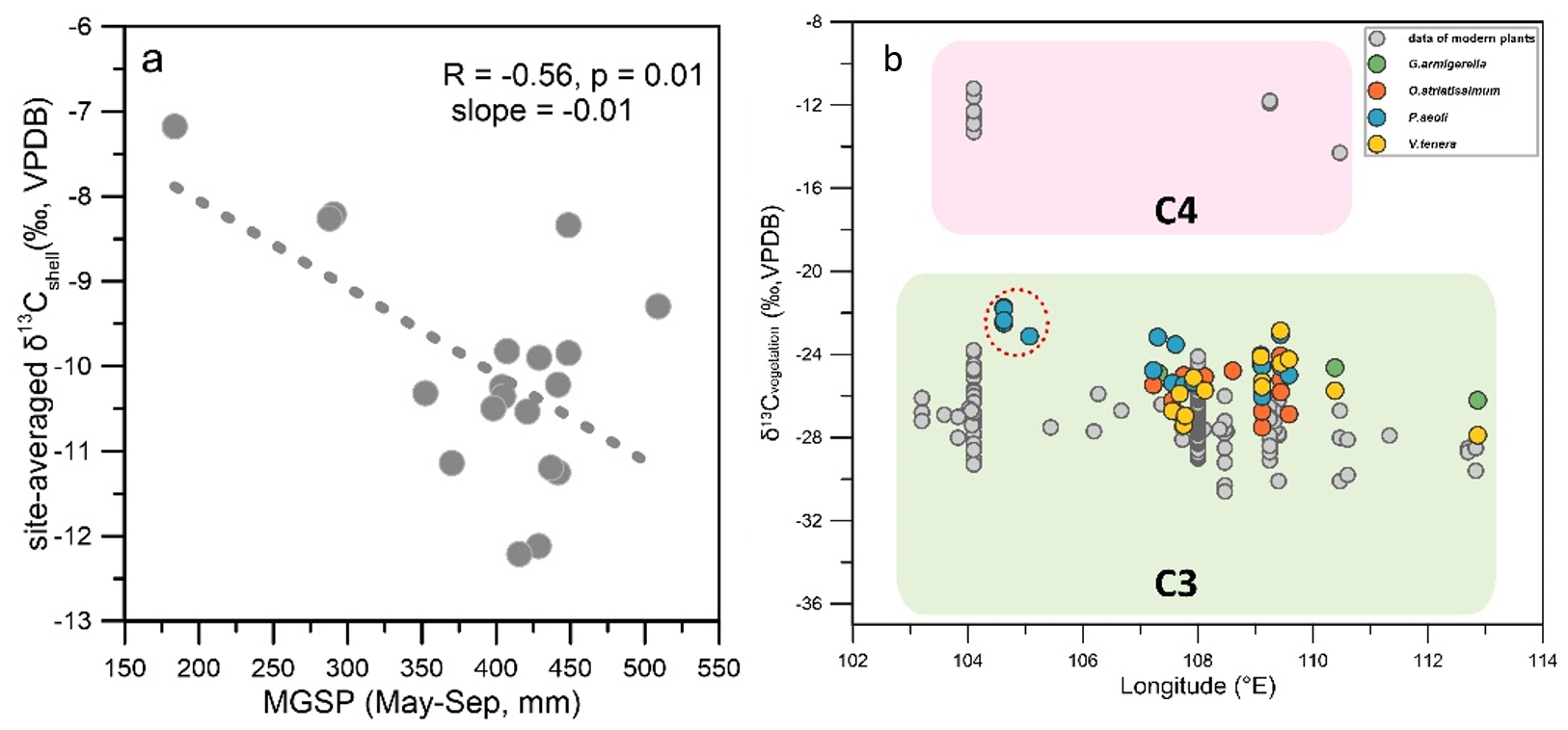 图2. (a) 蜗牛壳体碳同位素与降水量的关系; (b) 黄土高原C3/C4植被δ13C值与理论计算的蜗牛食物δ13C值对比.