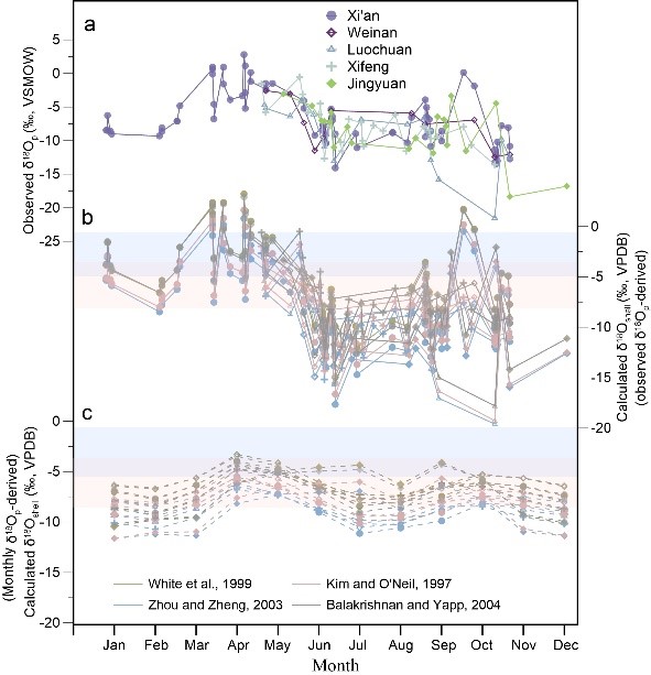 研究表明:(1)蜗牛壳体碳同位素组成记录了当地C3植被信息(图2b),且对空间上降水量变化有良好的响应(图2a),有望成为可靠的降水量指标;(2)尽管研究区内蜗牛生长季降水量、温度和相对湿度等气候参数具有较大变化幅度,但这些气候参数均与蜗牛壳体氧同位素组成的相关性微弱(图3左);(3)氧同位素组成在空间上表现为离散的分布特征,这恰恰与实测研究断面上蜗牛生长季降水氧同位素组成的空间变化特征极其相似(图3右),指示了降水氧同位素可能是控制微小蜗牛壳体氧同位素的主导因素。鉴于我国黄土高原的黄土-古土壤序列中保存有大量微小蜗牛化石,本研究为更好地解读这些蜗牛化石记录的气候环境信息提供了良好基础。