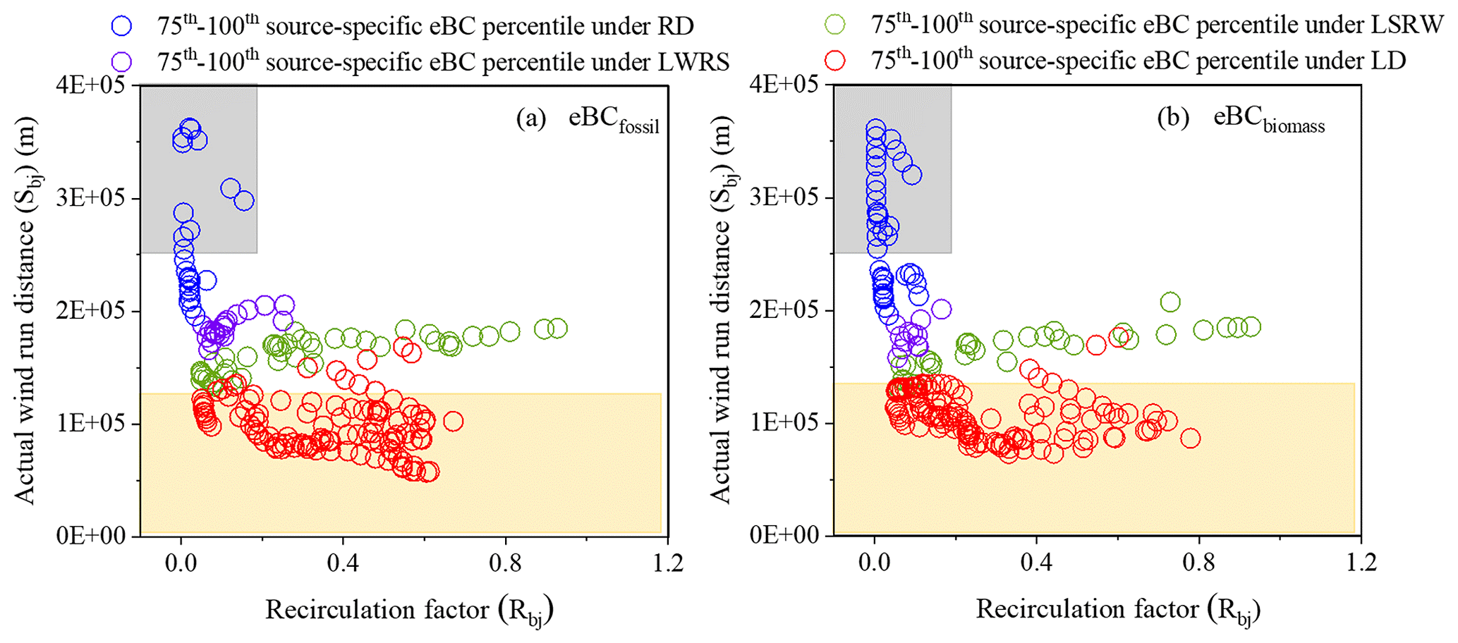 图1 四种气流类别下75th-100th分位的化石燃料eBC(a)和生物质eBC(b)的质量浓度随标量传播距离和气流循环因子改变的分布。灰色高亮区域气流流通良好的情况,黄色高亮为气流趋于静止的情况。