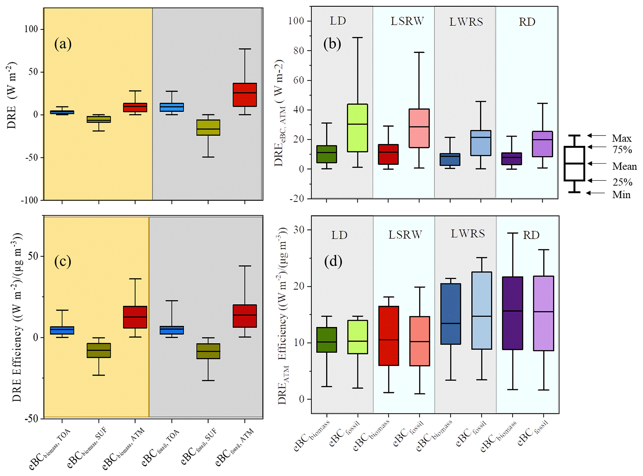 图2 (a)和(c)为生物质eBC和化石燃料eBC的直接辐射效应。(b)和(d)为四种气流分类下生物质eBC和化石燃料eBC产生的直接辐射效应和直接辐射效率。