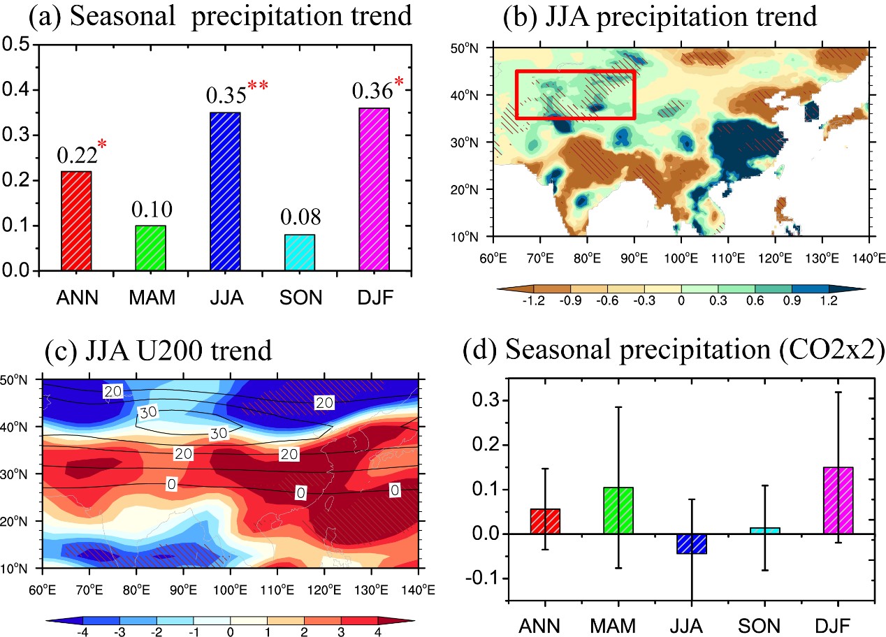 图1 1961到2005年亚洲中部干旱区降水(a, b)和西风变化趋势(c),以及温室气体加倍试验引起该地区降水的季节变化(d)