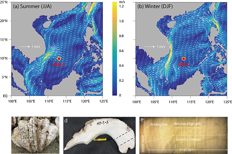 图1 南海夏季和冬季海表流速和MD-3砗磲壳体及切割断面