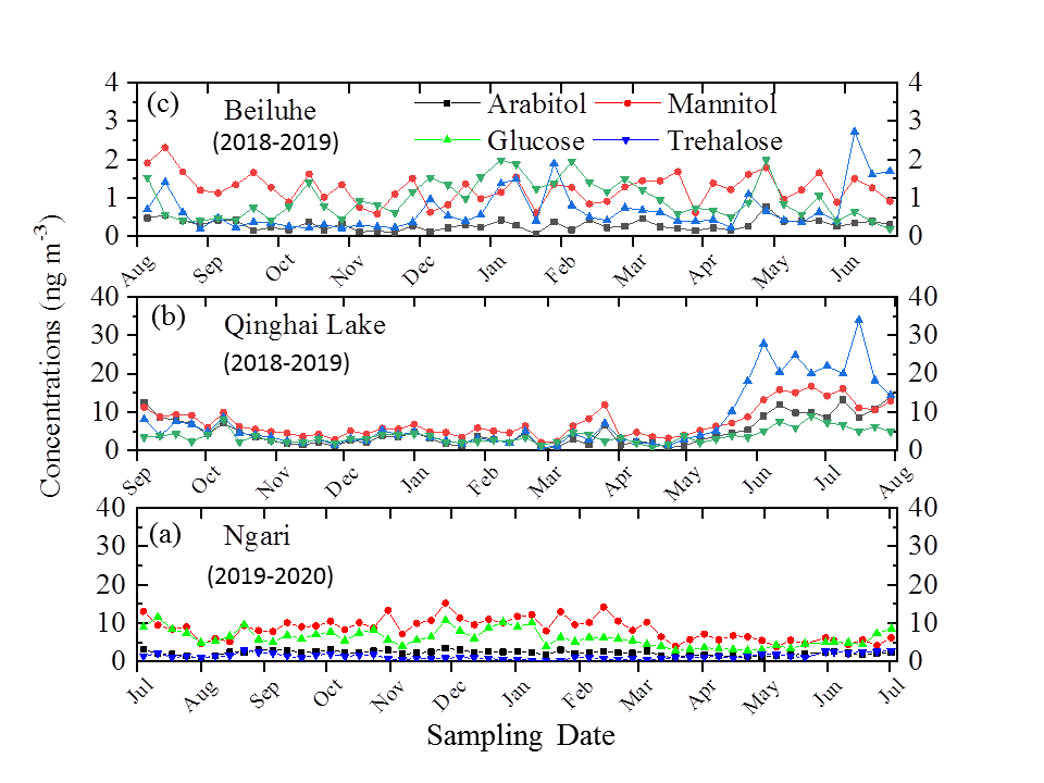 生物圈释放的大气一次生物气溶胶(PBAPs)在地球系统中广泛存在,阿拉伯糖醇、甘露醇、葡萄糖和海藻糖是主要的生物源组分,并作为示踪物应用于PBAPs的表征和解析。有研究指出PBAPs对大气棕碳有重要贡献,但对青藏高原区域PBAPs的性质及其对棕碳贡献的研究较少。