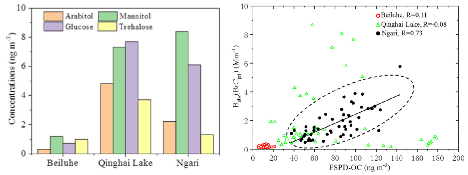 中国科学院地球环境研究所朱崇抒研究员等人在青藏高原高海拔区域(阿里、北麓河和青海湖)开展工作,探讨了PBAPs关键示踪物的季节变化特征及其与棕碳光学吸收的关系。结果表明:高原东北和西南区域生物源组分浓度较高,核心区浓度很低,高原生物源气溶胶有显著的空间差异。PBAPs组分与一次棕碳光吸收的关联分析表明,PBAPs可能是高原西南区域棕碳的重要组成部分。青海湖棕碳及其吸收埃指数最高,表明该区域非化石燃料燃烧排放的贡献较大。并探讨了PBAPsFSPD OC(生物源有机碳)的潜在贡献源区分布,包括青藏高原内部和恒河平原等。由于PBAPs对大气环境和气候的潜在影响,针对青藏高原环境变化敏感区域开展其化学组成与棕碳光吸收之间关系的研究应给予更多的关注。