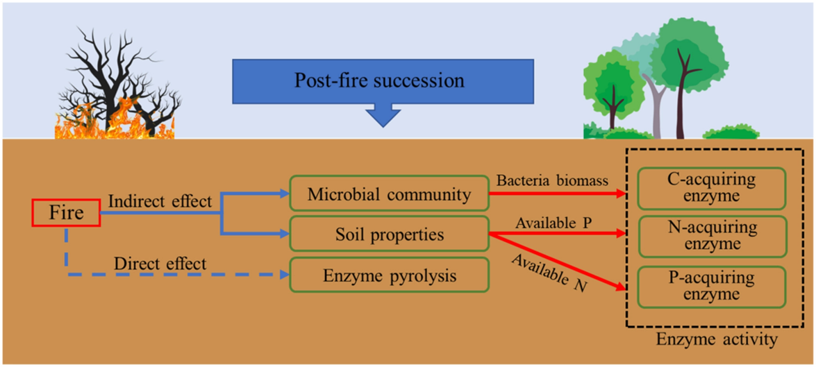 图1火灾后土壤性质、微生物群落和胞外酶活性变化的概念框架。虚线反映了火灾引起的细胞外酶在火后立即变性。实线显示火灾对土壤性质和微生物群落的间接影响。红色路径反映了控制火对C、N和P获取胞外酶活性影响的主要因素。