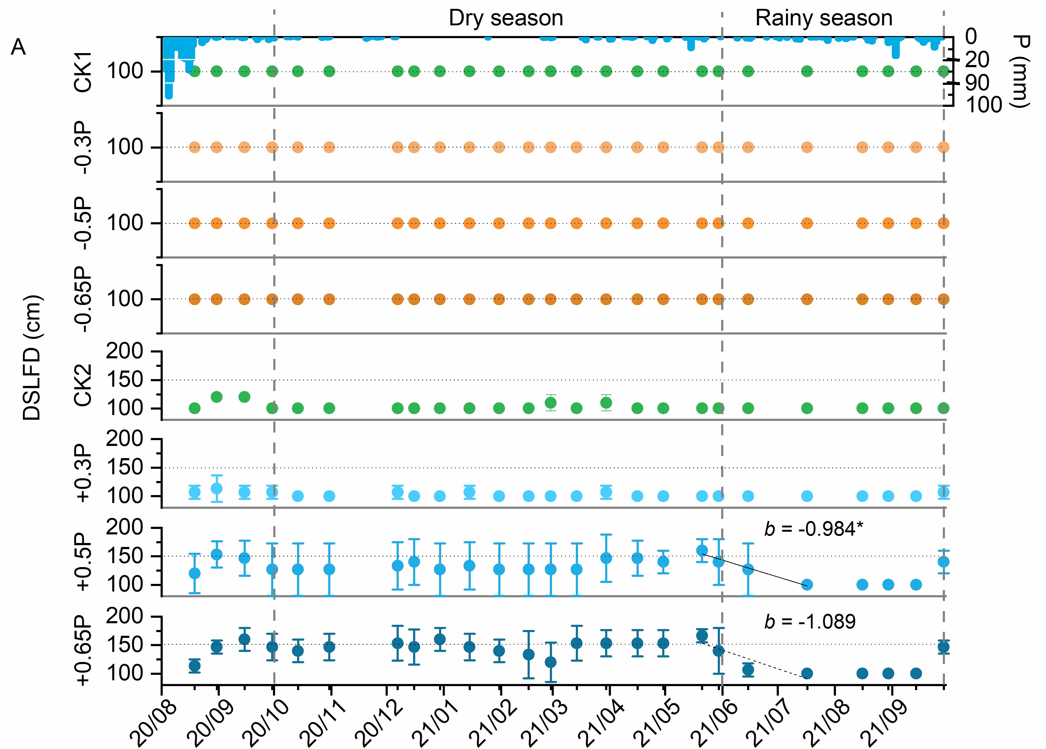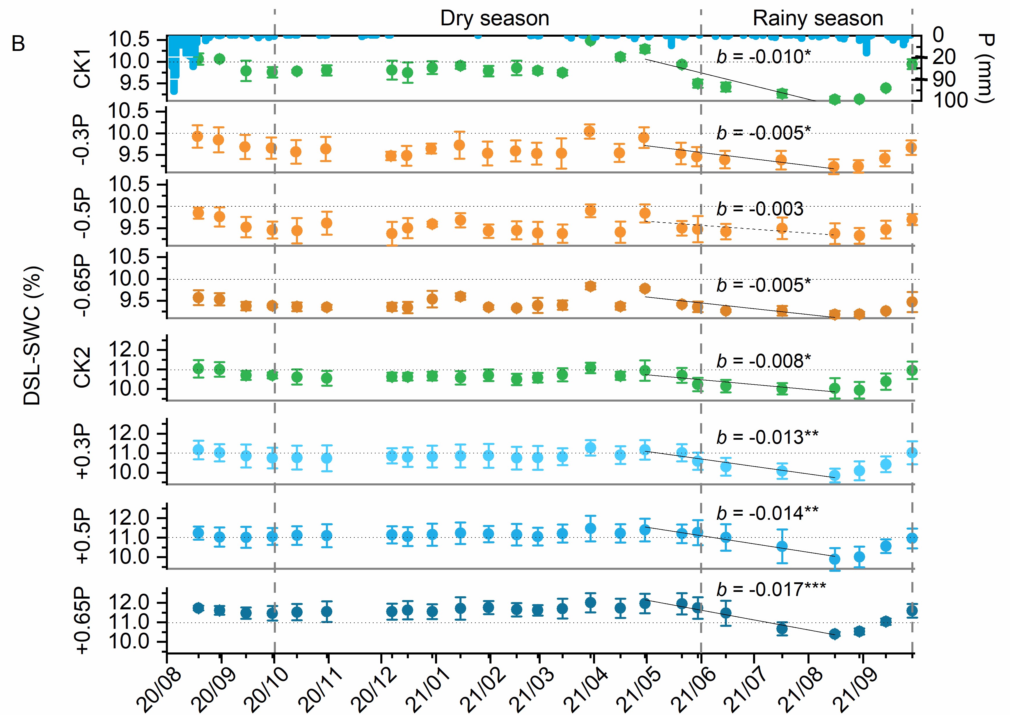 研究结果表明:(1)0–21 m剖面平均土壤水分与土壤干层内平均土壤水分(DSL-SWC)在截水处理下分别降低了0.44%–0.77%和0.13%–0.36%,而在增水处理下分别增加了0.33%–0.95%和0.16%–0.92%;(2)土壤干层起始形成深度(DSLFD)在截水处理下基本不变(100 cm),增水处理下范围为100–180 cm;(3)土壤干层变化存在季节性差异,如旱季和雨季间的过渡期,截水处理和增水处理下DSL-SWC降幅最大,但与截水处理相比,增水处理下由根系吸水导致的DSL-SWC减少速率更快(图3);(4)DSL-SWC增量随降水增加呈显著(p < 0.05)线性增加趋势,且增水处理下水分增加速度比截水处理下更快,表明土壤干层在丰水条件下(与干旱相比)对降水变化响应更敏感。