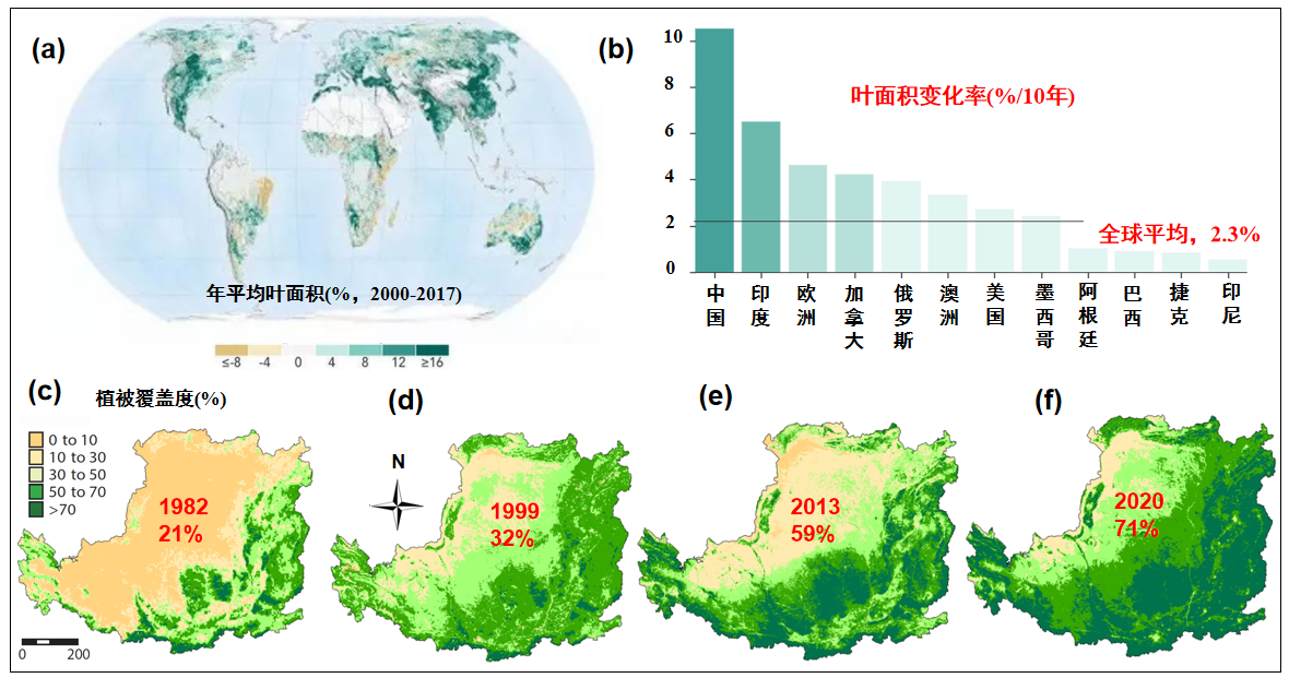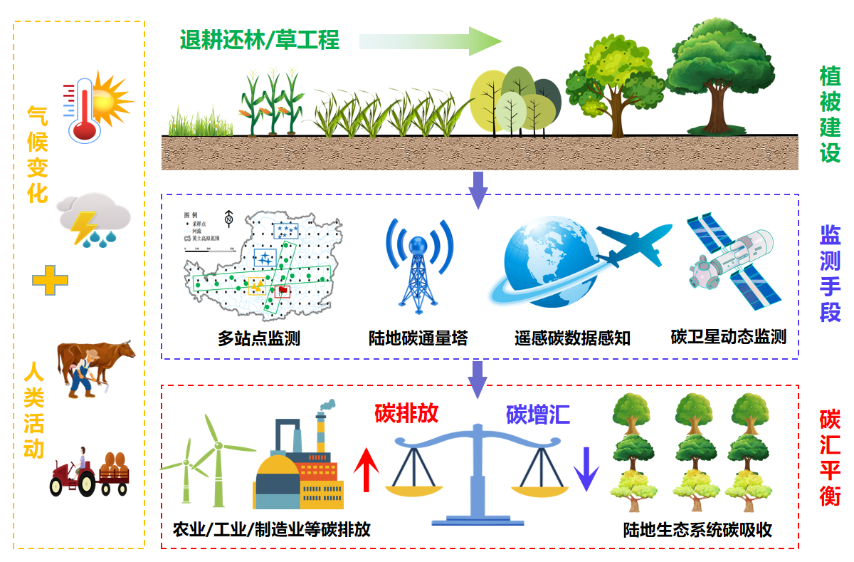 陆地生态系统固碳是当前减缓大气CO2浓度升高的重要途径之一。我国陆地生态系统是显著的碳汇,在过去几十年一直扮演着重要的碳汇角色,在以往研究中被严重低估。黄土高原是我国“一带一路”建设的倡议地、天然的西部生态屏障区和典型的生态脆弱区,在“黄河高质量发展”的重大战略背景下,黄土高原生态系统碳汇效应将迎来新的转机和严峻的挑战。在全球近20年的新增植被绿化面积中,我国的贡献比例最大,占比约为25%;其中,黄土高原是我国植被变绿增幅最大的区域之一(图1)。自1999年以来的一系列大规模的植被恢复和重建工程,黄土高原的生态环境有所改善,植被覆盖度显著提高,土壤碳汇能力显著提高。在气候变化和植被恢复的背景下,需要充分并全面提升黄土高原生态系统的碳汇功能。