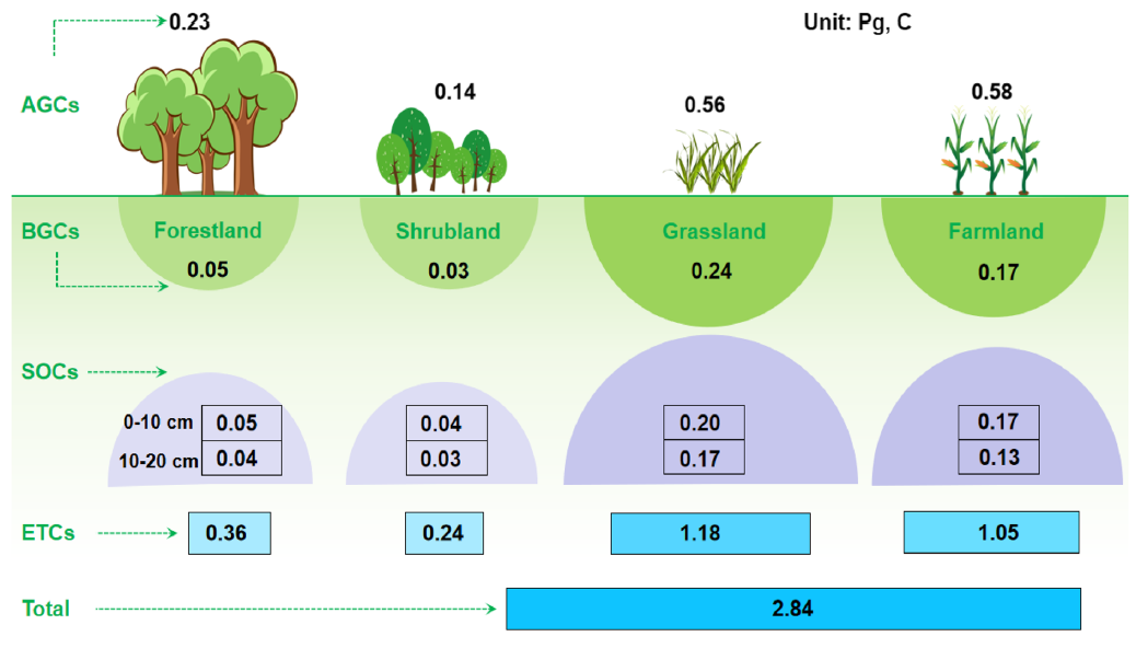 为充分了解黄土高原在植被恢复过程中的土壤固碳机制,中国科学院地球环境研究所杨阳副研究员和王云强研究员等人联合德国哥廷根大学、俄罗斯秋明州立大学、西北农林科技大学、陕西师范大学、中国科学院西北生态环境资源研究院等多家单位,针对黄土高原植被恢复过程中的土壤固碳问题,通过对整个黄土高原大面积的野外采样和调查(图2),估算黄土高原整个生态系统碳储量为2.84 Pg,其中林地为0.36 Pg、灌丛为0.24 Pg、草地为1.18 Pg、农田为1.05 Pg;表层土壤(0 ~ 20 cm)中的碳储量占30%,地上生物量占53%,根系占17%(Yang et al, 2023, Carbon Neutrality)(图3)。进一步发现黄土高原生态系统碳储量的大尺度分布格局主要受气候调控,这为我国生态系统碳汇功能提升提供了可靠的科学依据。