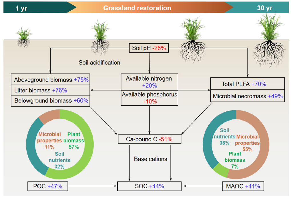 我们进一步将土壤有机碳(SOC)分为不同的功能型组分,例如颗粒有机碳(POC)和矿物结合有机碳(MAOC),二者的其比例的变化决定土壤有机碳的周转速率及稳定性,对于理解和预测SOC动态及其对全球环境变化的响应非常重要。先前的研究表明黄土高原草地恢复增加了土壤碳储量(Yang et al, 2022, Soil Biology and Biochemistry),针对黄土高原草地恢复过程中SOC的稳定机制,进一步的区分土壤POC和MAOC,发现黄土高原草地恢复30年后土壤MAOC增加了41%,土壤POC增加了47%(Liao et al, 2023, Journal of Environmental Management)(图4)。其中MAOC的增加主要是由土壤微生物残体和碱离子(Ca-bound C)淋溶的共同作用引起的;POC增加的主要是由植物生物量所导致。随着植被的恢复,SOC的累积由MAOC为主导转变为POC为主导,其中POC对植被恢复的响应更为敏感。由此可知,POC和MAOC的积累对黄土高原植被恢复过程中SOC的固存与稳定具有重要意义。