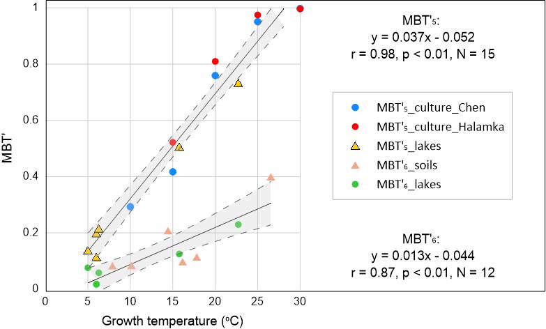 图1. 5-甲基brGDGTs组甲基化指数(MBT'5)和6-甲基brGDGTs组甲基化指数(MBT'6)与温度的定量关系。