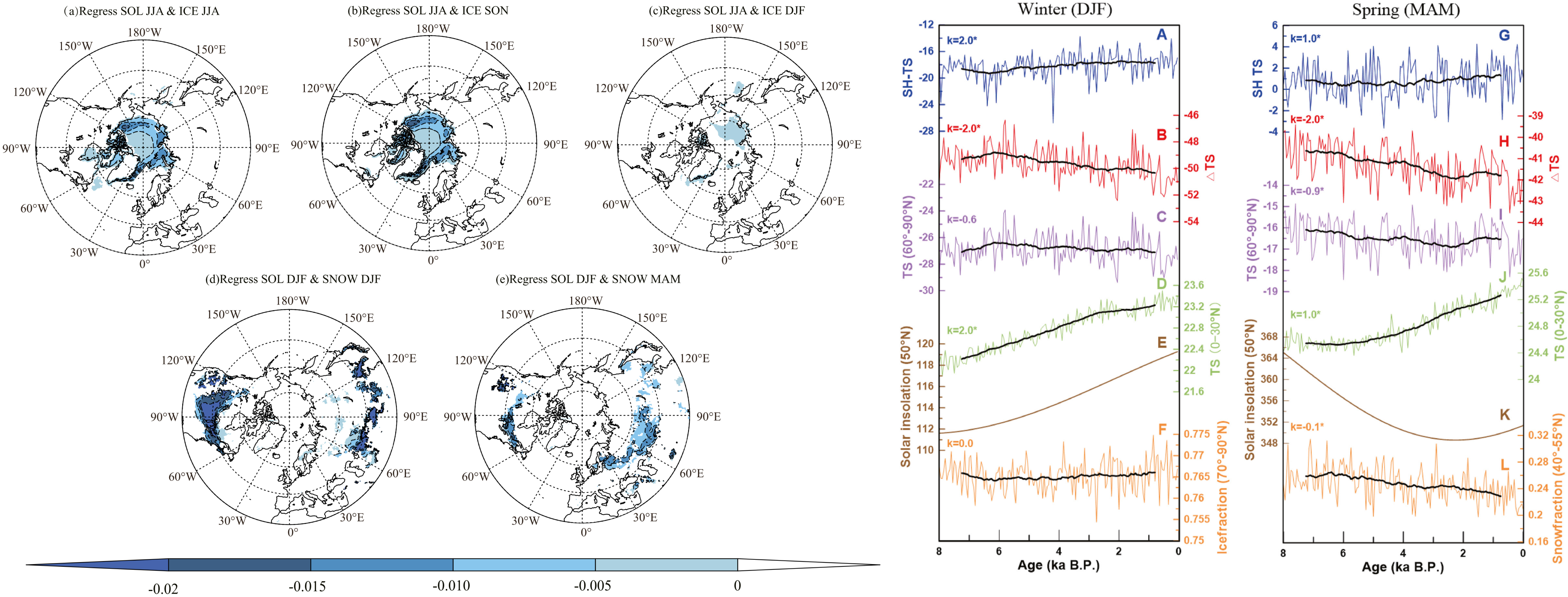 图2 中全新世以来轨道日射对季节性海冰和积雪的调制作用影响了东亚冬季风变化