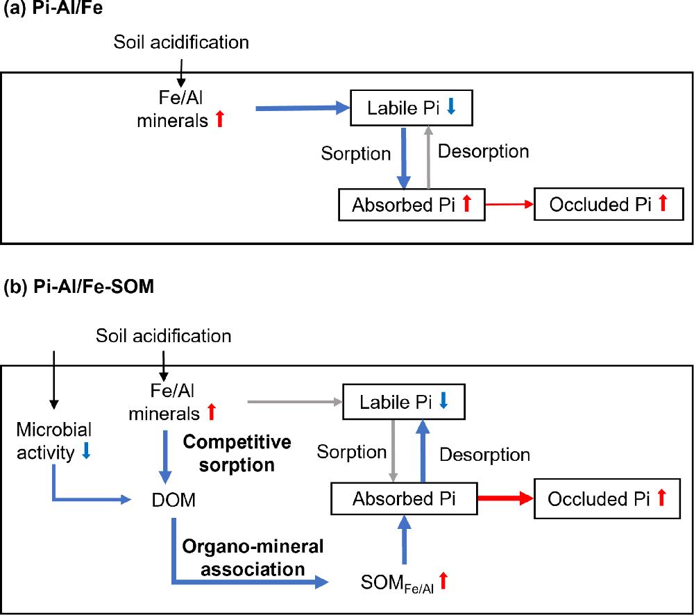图1 土壤酸化过程中,有机质和铁/铝矿物相互作用的变化对土壤无机磷吸附和解吸动态的影响。