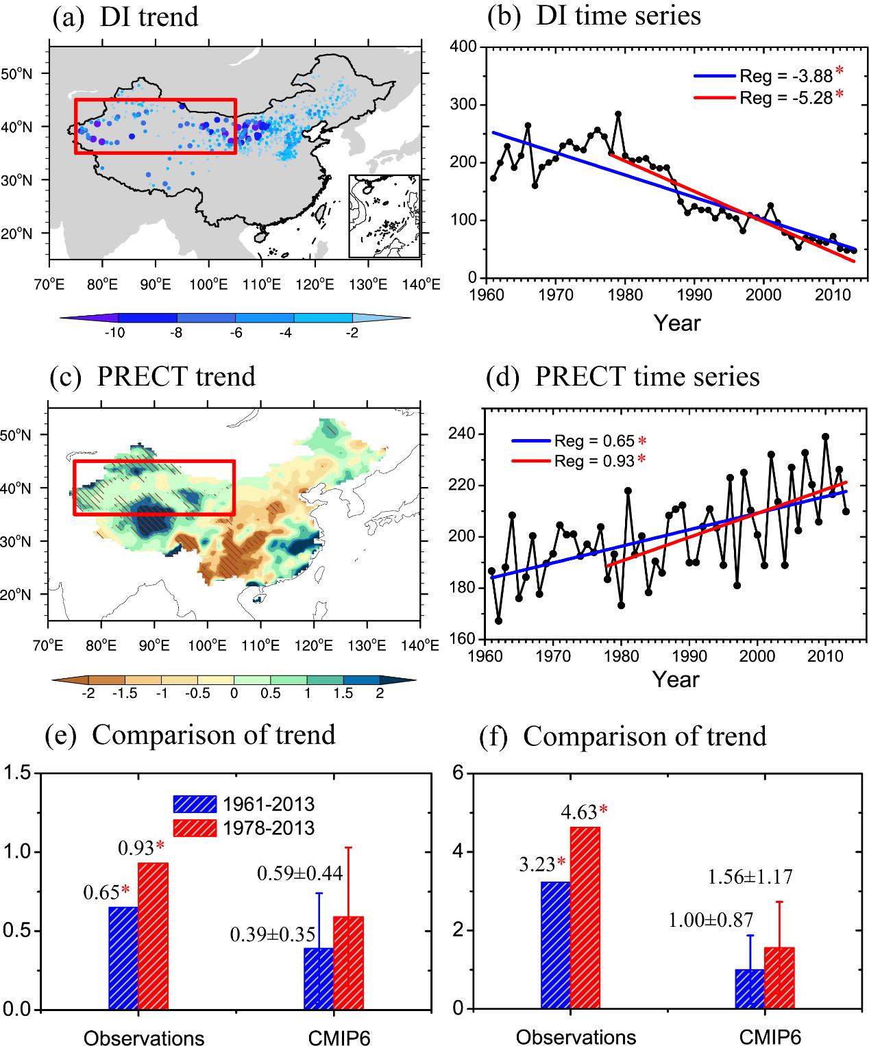 我国西北干旱区位于亚洲内陆深处,常年降水量偏少,属于典型的内陆干旱和半干旱区,该区域生态环境脆弱且对气候变化的响应敏感。近几十年来,西北地区持续变湿,表现为地表降水增加、主要河流径流量加强、湖泊水位上升及植被恢复等现象,但西北干旱区气候变湿的原因尚不完全清楚。同时,在全球变暖背景下近几十年来西北干旱区沙尘活动也显著减弱 (图1)。中国科学院地球环境研究所气候变化集成-模拟-同化-预测科研团队解小宁研究员等联合中国气象科学研究院及美国布鲁克海文国家实验室科学家的最新研究表明,源区沙尘活动减弱与西北干旱区变湿之间可能存在着因果联系。