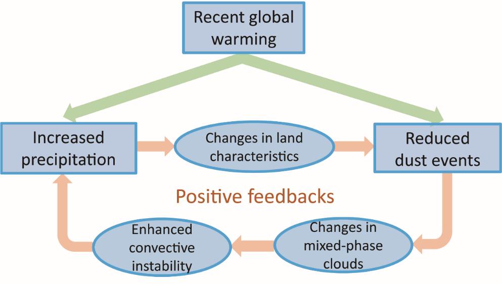 基于观测分析及敏感性数值试验,他们探讨了区域沙尘活动减弱对西北干旱区降水的可能影响。研究结果表明,(1)全球气候变暖引起的东亚沙尘活动减弱(沙尘气溶胶粒子减少)会通过降低冰核浓度对混合相云产生显著影响,加强对流降水和极端降水,进而造成西北干旱区降水量明显增加。考虑沙尘粒子的冰核效应可能会有效地减少CMIP6多模式模拟与站点观测降水趋势之间的差异 (图1)。(2)基于敏感性数值试验结果,提出了一种新的对流增强机制,即沙尘气溶胶粒子的减少可以通过改变混合相云的微物理特性增强大气垂直温度梯度和对流不稳定性,最终导致对流增强和降水量增加。然而,这种沙尘减少-对流加强机制在北非沙尘源区模拟结果中并不适用。在北非低纬度干旱区,混合相云和冰云相对较少,沙尘减少并不能增加区域降水,反而加剧了北非的干旱,因为北非降水主要受到沙尘气溶胶直接加热影响下的北非季风扰动所控制。(3)利用检测归因模式比较计划(DAMIP)多模式结果分析表明,在全球变暖背景下,中国西北干旱区未来数十年将持续变湿。由全球变暖驱动的西北干旱区沙尘活动显著减弱进一步加强区域变湿,气候变湿也有助于沙尘活动减弱,从而形成了一种正反馈过程,影响着该区域历史时期和未来的干湿变化 (图2)。此外,该区域降水还受到南亚和东亚地区人为气溶胶的远程影响。