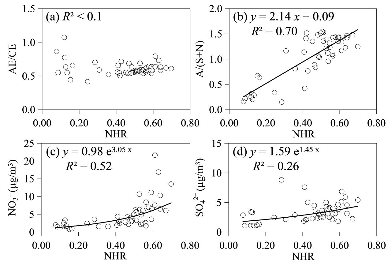 图2 华山山顶NHR与AE/CE(a) , A/(S+N)(b),PM2.5中NO3-浓度(c)及SO42-浓度(d)的相关性分析