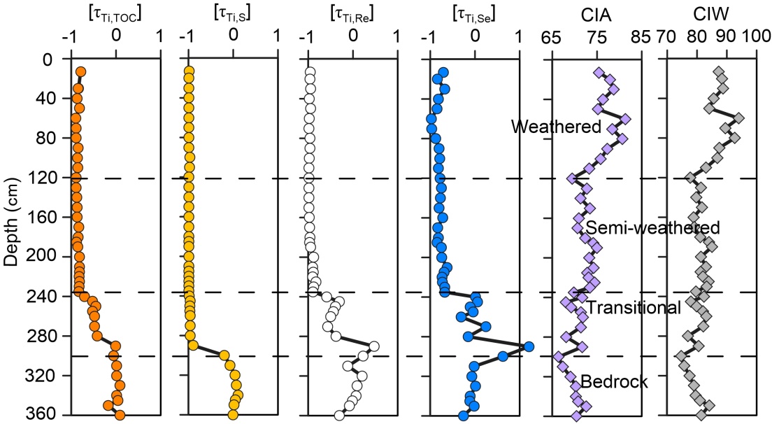 中国科学院地球环境研究所金章东研究团队以重庆城口地区下寒武统的黑色页岩风化剖面为研究对象,对该剖面Re和硒(Se)的来源、风化过程中的活动性及与化石有机碳和硫化物的关系开展了系统研究。首先,结合逐级提取实验,发现该黑色页岩中Re和Se主要存在于有机相中(图1)。随后,根据风化剖面上Re、Se、TOC和S等的迁移系数变化,发现Re和Se在风化过程中与化石有机碳耦合流失,而与硫化物氧化无关(图2)。更重要的是,由于两元素在风化过程中不同的地球化学行为,Re的流失比例略高于化石有机碳,而Se的流失略低。最后,该研究团队指出,Re的确可用于示踪化石有机碳风化,而Se可能是另一潜在指标,进而提出未来需要更多剖面与流域相结合的研究,进一步明确河水Re和Se的来源及其与流域化石有机碳风化的关系。