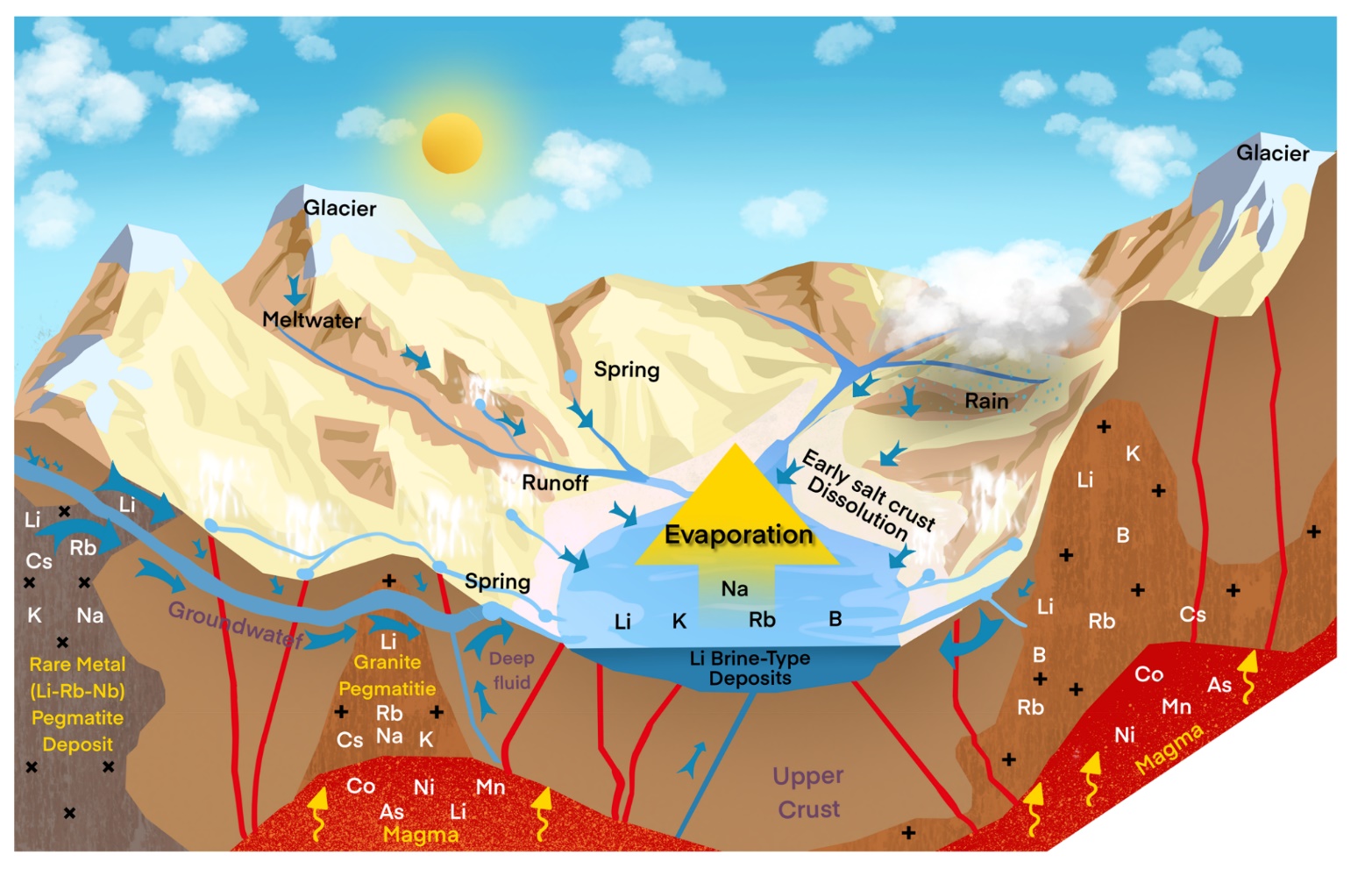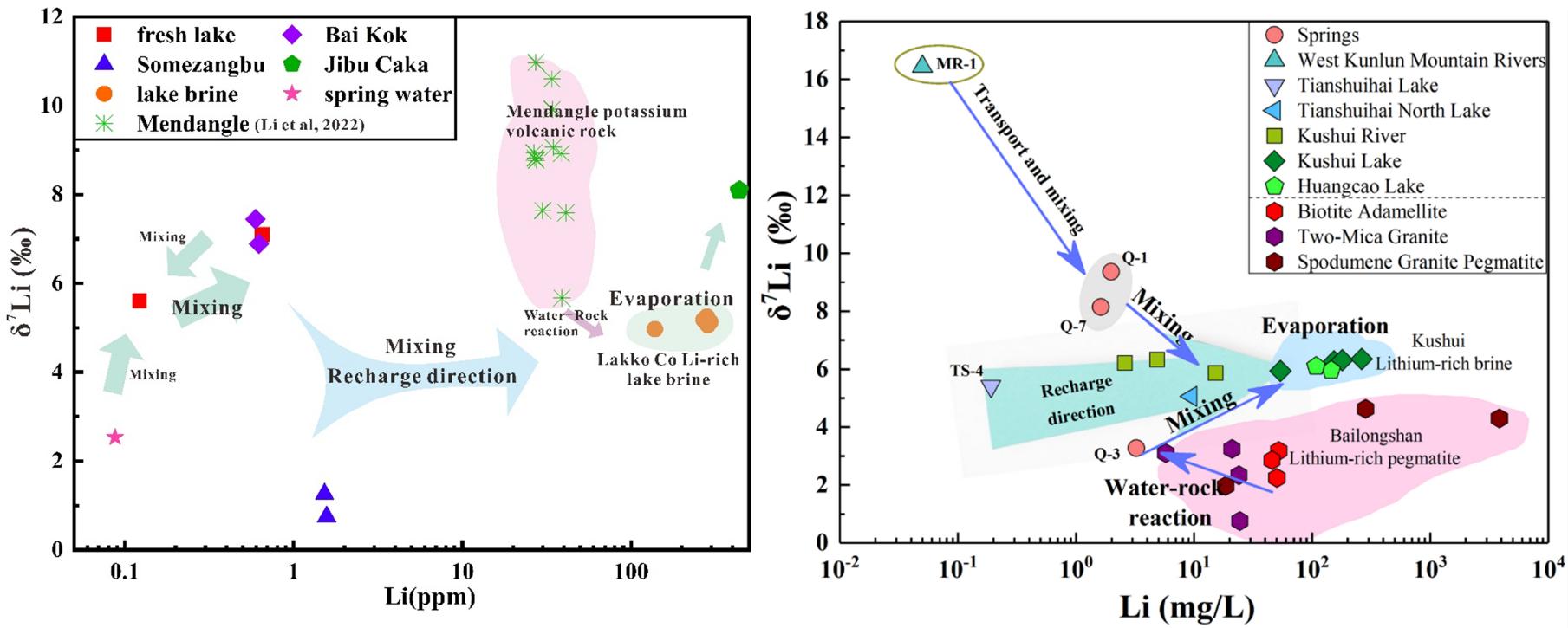 中国科学院地球环境研究所地表过程与生态环境实验室贺茂勇研究员联合中国科学院青海盐湖研究所、长安大学、太原理工大学等,从2012年开始,对青藏高原的柴达木盆地盐湖和西藏盐湖进行系统采样并进行非传统稳定同位素锂和硼示踪研究,取得阶段性重要进展。通过西藏拉果错盐湖、班戈错盐湖以及与伟晶岩型锂矿床相毗邻的苦水湖的“源-汇”系统的研究,研究认为不同“源-汇”系统高锂地质背景的基岩和花岗岩伟晶岩锂矿床,通过表生地球化学系统中地表风化、吸附、端元混合等过程对盐湖富硼和锂有重要贡献。更重要的是,无论“源-汇”空间范围的大小,深部地热流体对富锂盐湖均有贡献,但其贡献量仍有待进一步评估(图1)。