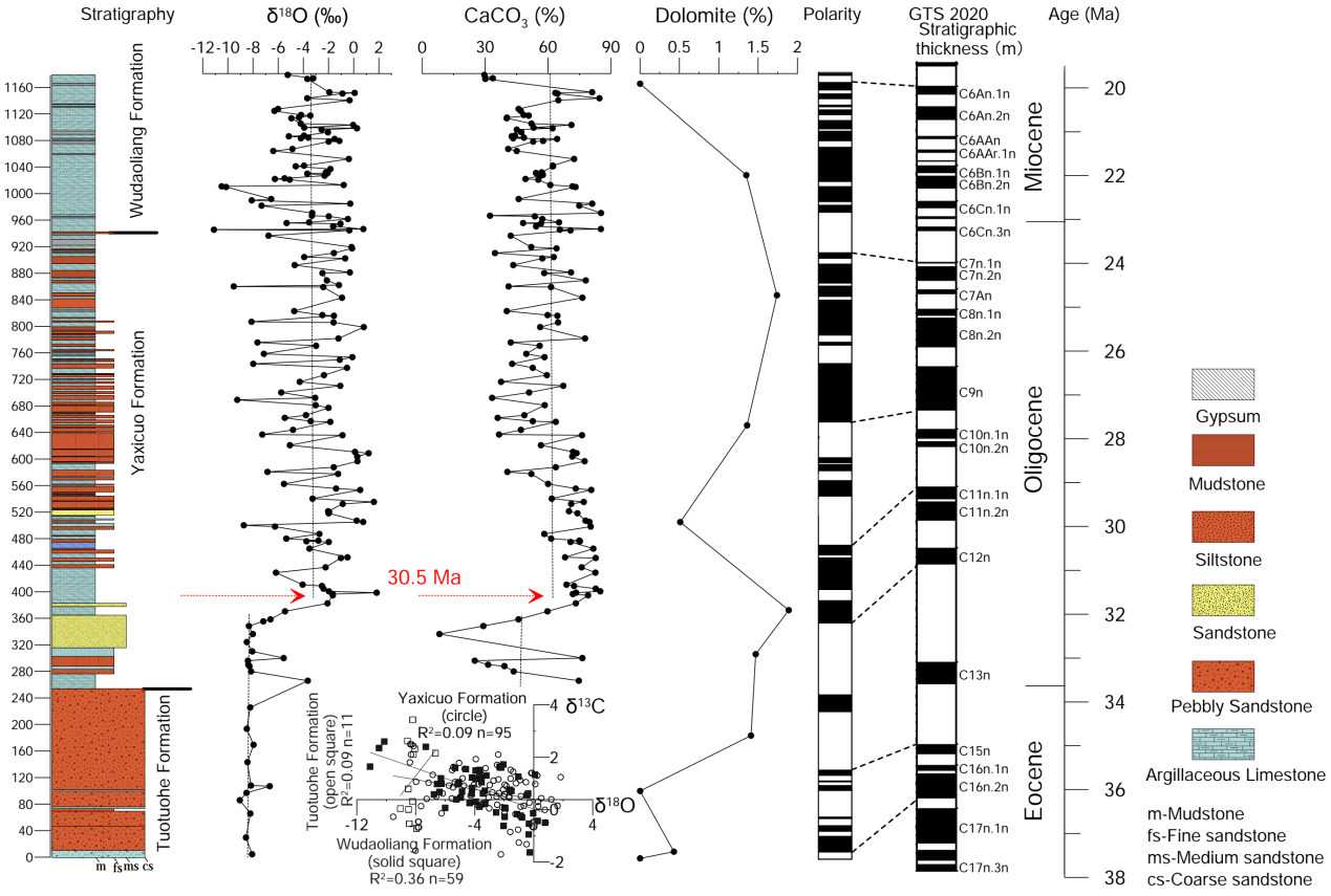 碳酸盐岩氧同位素和研究区附近碳酸盐岩已有的氧同位素记录综合分析结果显示,沱沱河盆地的碳酸盐岩氧同位素在30.5Ma发生了明显的正偏(图1)。