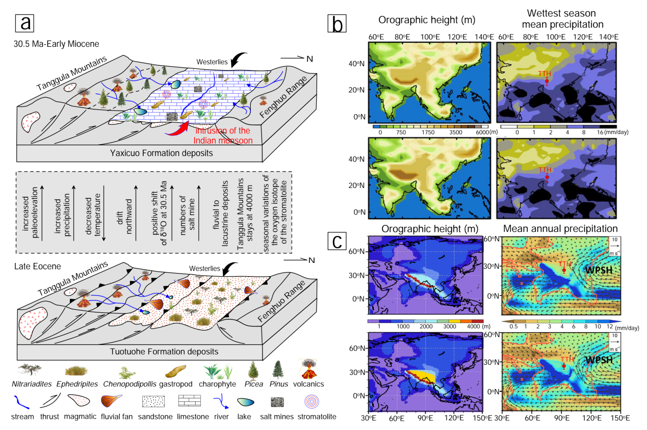 图2. 沱沱河盆地晚始新世和30.5-早中新世构造、气候系统概念图。