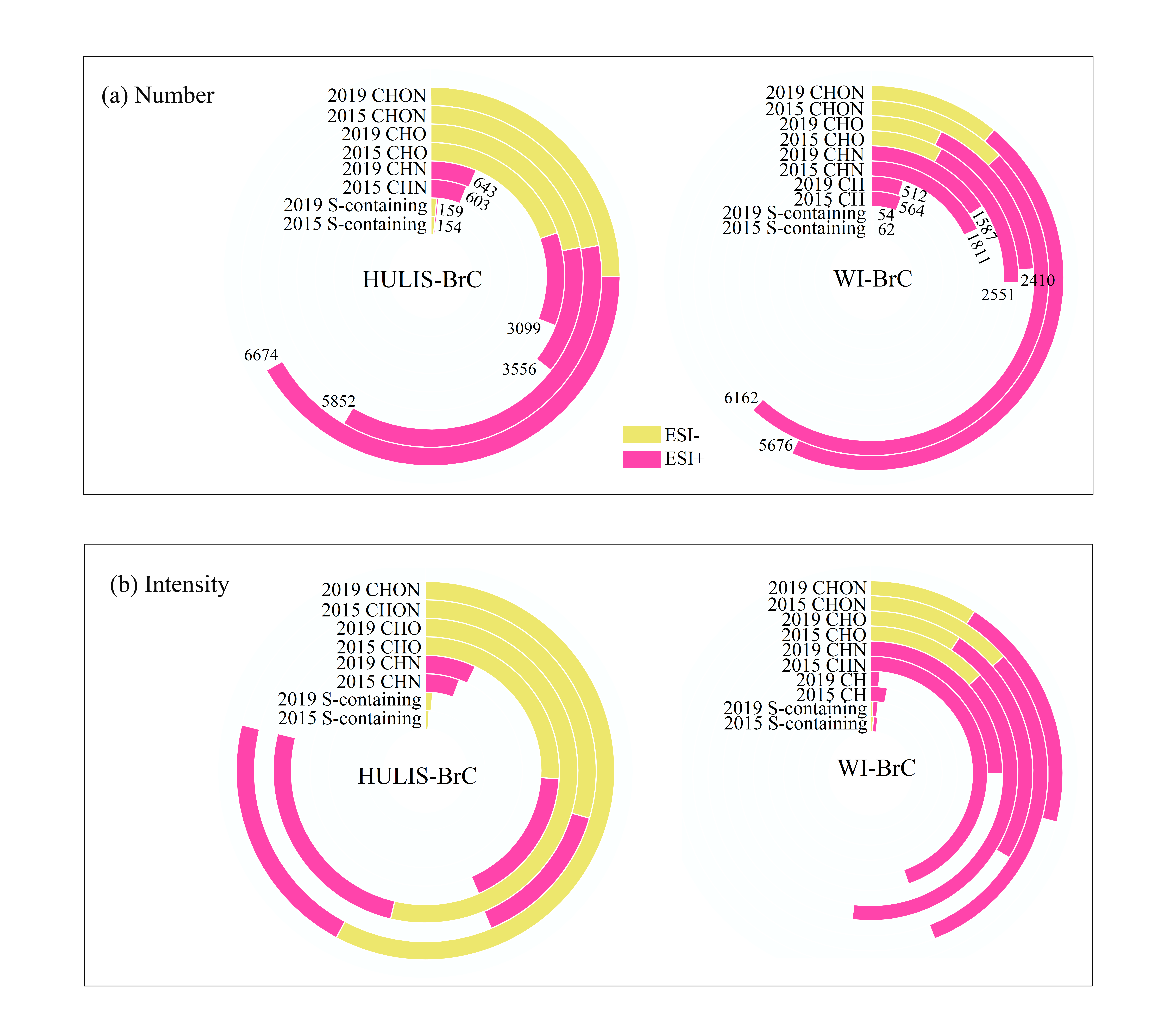 1. “煤改气”工程前(2015)后(2019HULIS-BrCWI-BrC组分中不同元素组成发色团(a)数量和(b)质谱峰强度