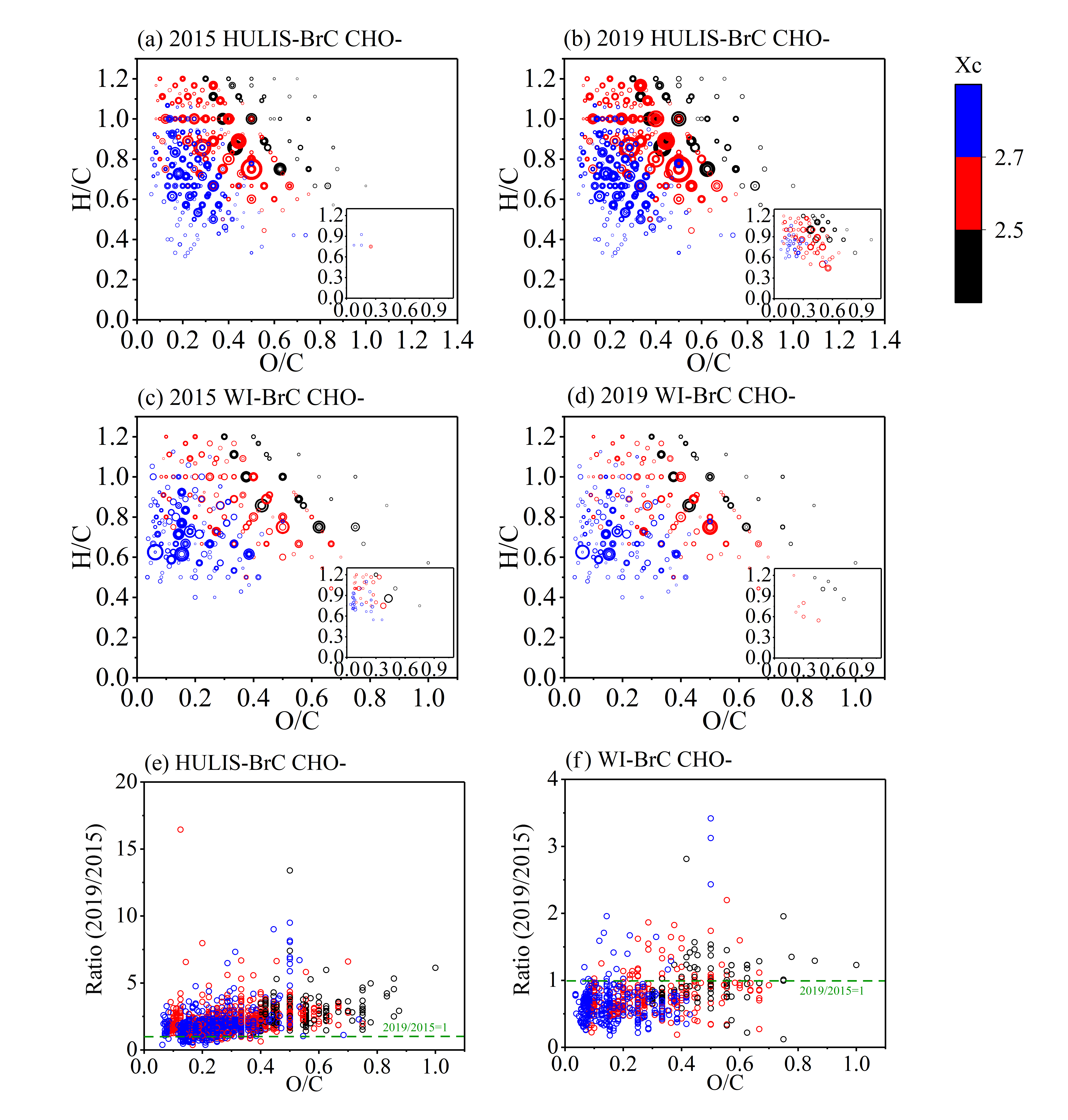 2. “煤改气”工程前(2015)后(2019HULIS-BrCWI-BrC组分中CHO发色团的(a, b, c, dVan Krevelen图和(e, f)质谱峰强度比
