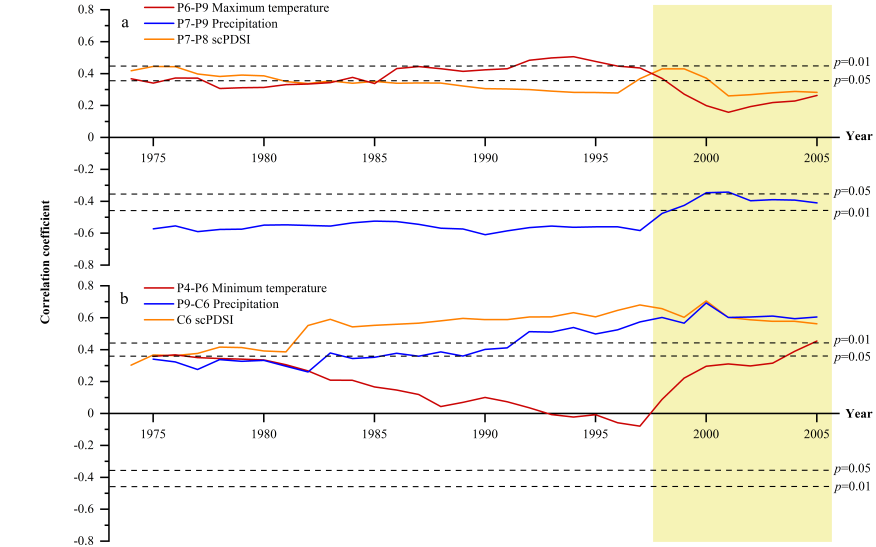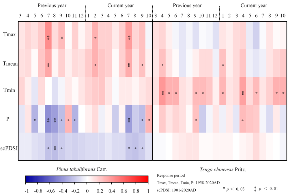 秦岭是天然油松(Pinus tabulaeformis Carr.)分布的最南界,也是天然铁杉(Tsuga chinensis Pritz.)生长的最北界。中国科学院地球环境研究所极端气候事件及影响(EXCEIS)团队以秦岭南坡同一栖息地的油松和铁杉为研究对象,通过树木年轮学方法分别建立了油松和铁杉的树轮宽度(TRW)年表。分析结果表明,生长在同一栖息地的油松和铁杉的TRW都与温度呈正相关关系,然而,它们对降水和scPDSI(帕尔默干旱指数)的响应存在差异。油松TRW与月降水量和scPDSI主要呈负相关关系,而铁杉TRW与降水量主要呈正相关关系(图1),它们对水分条件响应的差异可能与两个针叶树种之间的物种偏好有关。器测时段的31年滑动相关分析(图2)和K-S检验分析结果表明,油松和铁杉TRW对关键气候因子的响应模式随着时间变化都发生了质的改变:油松TRW对前一年6月至9月平均最高气温的正响应随时间减弱变为无响应;尽管其对前一年7月至9月降水量的响应随时间变化仍呈显著负相关,但显著程度有所下降。相比之下,铁杉对前一年9月到当年6月降水量的敏感性随时间变化而增强。