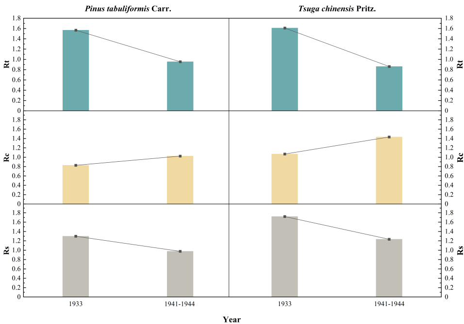 针对树木生长对干旱事件的抵抗力(Rt)、恢复力(Rc)和弹性力(Rs)的研究表明,油松和铁杉的干旱响应模式较为一致(图3)。1933年的短暂干旱事件没有对油松和铁杉产生显著负面影响,然而,当面临1941–1944年的长期严重干旱事件时,这两个树种的TRW都出现了下降,可见干旱事件的持续时间和严重程度对抑制这两个物种的生长起着重要作用。尽管如此,油松相较于铁杉表现出更强的抗旱能力。