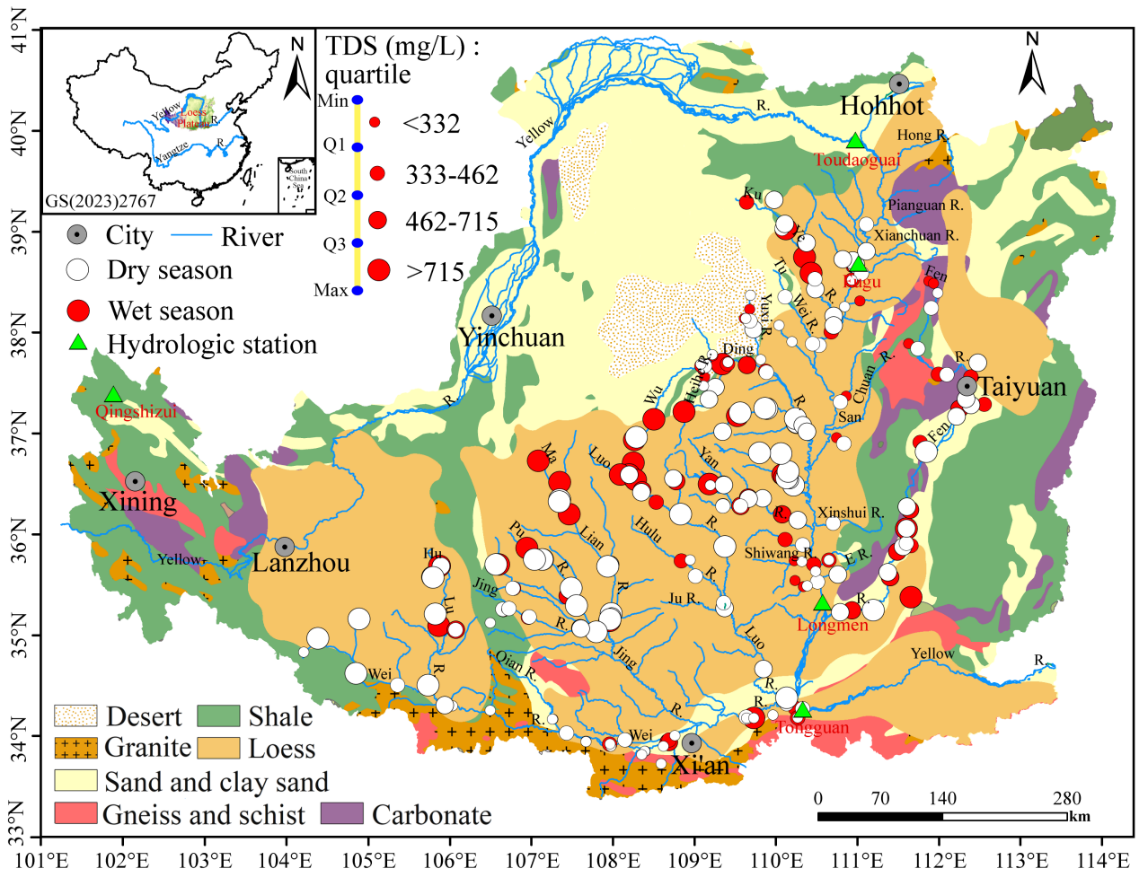 为此,地球环境研究所的肖军研究员联合长安大学通过黄土高原地区季节性河水的离子分析,揭示了黄土现代性风化过程及碳消耗。研究发现:黄土高原地区河水呈现弱碱性,TDS值在丰水期时较高且从西北向东南递减(图1)。河水溶质主要来自蒸发盐溶解和碳酸盐风化。相对于枯水期,丰水期持续时间虽然较短,但由于风化速率的加强导致其贡献了全年中约一半的大气CO2消耗量。通过对比发现,径流量是蒸发盐溶解和碳酸盐风化的主控因素,而化学反应动力是硅酸盐风化的主控因素(图2)。