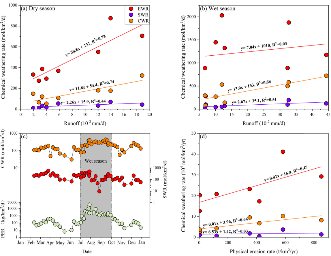 通过结合黄河流域其他地区河流的时间和空间数据,我们进一步探讨了黄河流域化学风化的时空差异及控制因素。结果表明,碳酸盐风化与径流量具有较强的正相关性。在物理侵蚀速率低的区域,硅酸盐风化速率与物理侵蚀速率保持一致。但在物理侵蚀速率高的流域,物理侵蚀的加强并没有有效的促进硅酸盐风化。此时,硅酸盐风化速率受到化学反应动力的限制。因此,径流量和化学反应动力是黄河流域化学风化时空变化的主控因素。