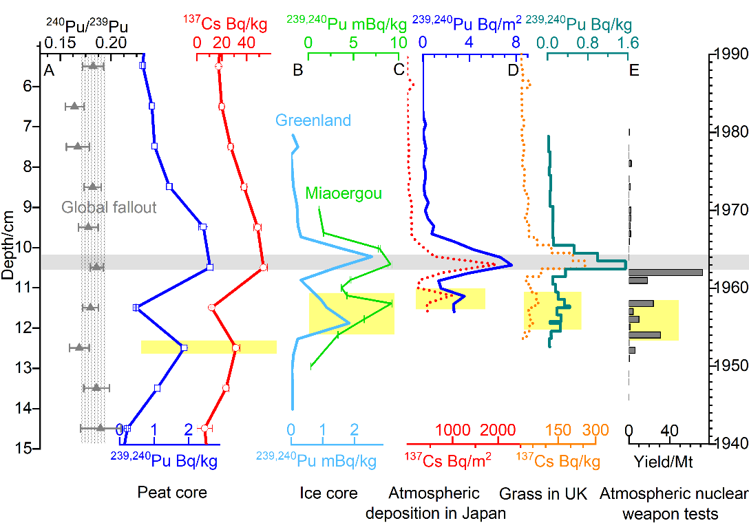 图1 伊吾泥炭239,240Pu的时间变化及其与已报道大气沉降记录、大气核武器试验当量的对比