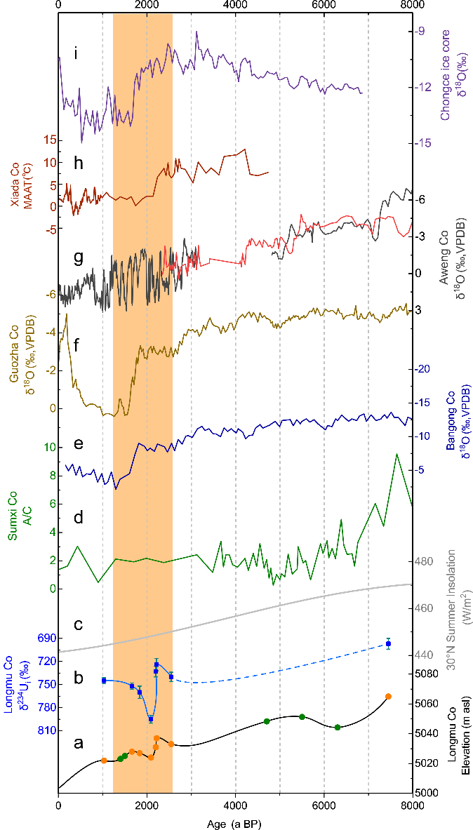 中国科学院地球环境研究所“极端气候事件及影响”团队(EXCEIS)谭亮成课题组测定了龙木错古湖岸线钙华沉积物的U-Th年龄及δ18O和δ13C等稳定同位素指标,并以此重建了该湖泊中-晚全新世湖平面演化历史。研究发现:(1)中全新世龙木错水位比现在高61 m,可能是由当时强盛的印度夏季风和较多的冰川融水导致。中全新世以后,北半球夏季太阳辐射减少导致的印度夏季风衰弱和入湖冰川融水减少共同造成了龙木错水位的下降;(2)湖泊水位在2.2 ka前后发生多次波动,最大下降幅度为13 m,这可能与青藏高原西北地区的局部快速降温事件导致的冰川融水量急剧减少有关。δ18O和δ13C也支持了湖水位波动所反映的区域气候变化;(3)钙华沉积物的初始δ234U(δ234Ui)与湖泊水位呈相反的变化趋势,这可能受地表的物理风化强度控制。钙华δ234Ui对地表沉积物的物理风化过程敏感,有望成为可靠的环境气候指标。