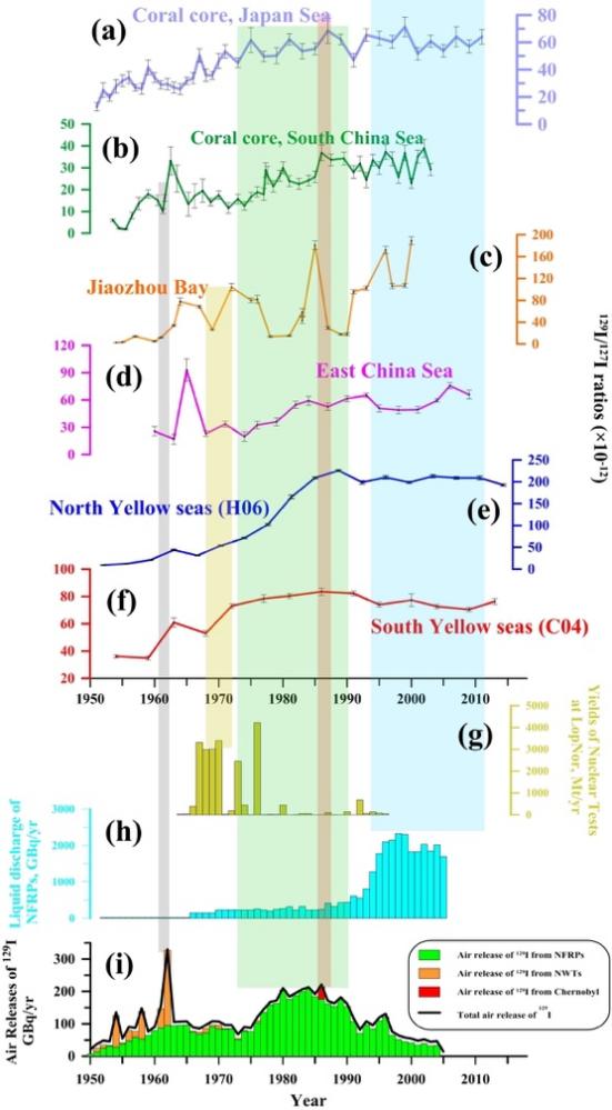 图1. 中国海域及其邻近海域沉积物和珊瑚样品中129I/127I的年代记录及129I主要排放源的年排放信息图