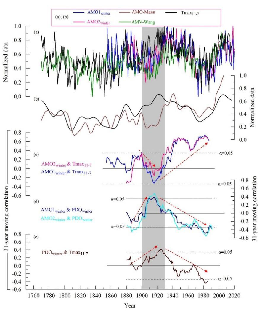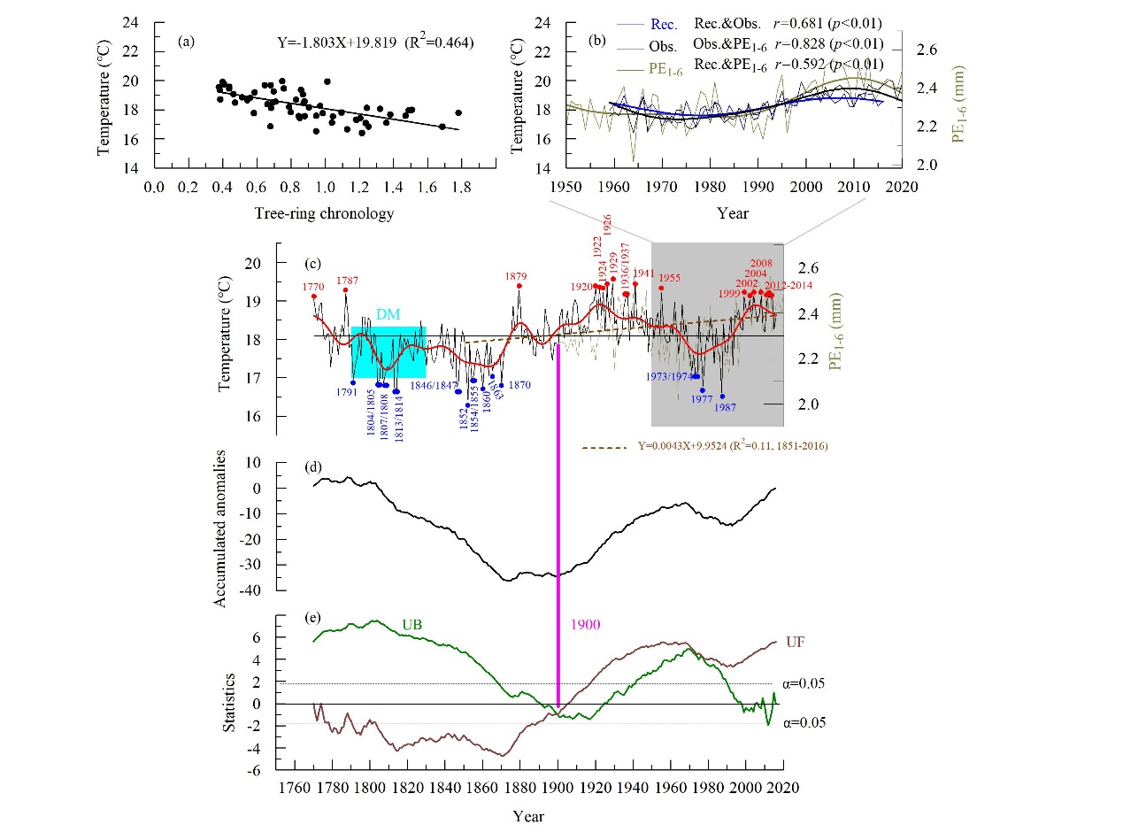 中国科学院地球环境研究所极端气候事件及影响(EXCEIS)团队以QBM西南部的白皮松为研究对象,通过树轮宽度气候学研究,重建了研究区过去250年的温度变化历史(Tmax11-7,图1)。新的温度重建证实秦巴地区记录了LIA的最后时段(~1770-1870年)。研究区19世纪相对寒冷,而20世纪相对温暖。但是,1970s以来研究区的变暖趋势仍在过去250年温度变化的框架内。该Tmax11-7重建记录不仅与基于历史文献重建的汉中地区冬季温度变化一致,而且揭示了较强的区域和半球温度信号(图2)。有趣的是,自1850年工业时代以来,在秦巴地区观测到的变暖趋势不如中国和北半球显著。进一步研究揭示,1770年以来秦巴地区的温度变化主要受控于NA-SST。然而,1900-1930年间由于PDO的干扰,NA-SST秦巴地区温度变化的影响减弱(图3)。这一研究提醒我们,未来秦巴地区的温度预测不仅要重点考虑NA-SST的作用,还要考虑PDO的调节作用。这项研究对于制定秦巴地区有效的环境管理和适应战略至关重要。