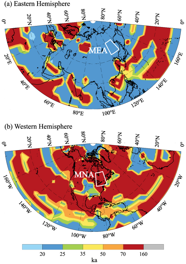 图中两个白色框分别指中纬度东亚MEA和中纬度北美MNA代表区