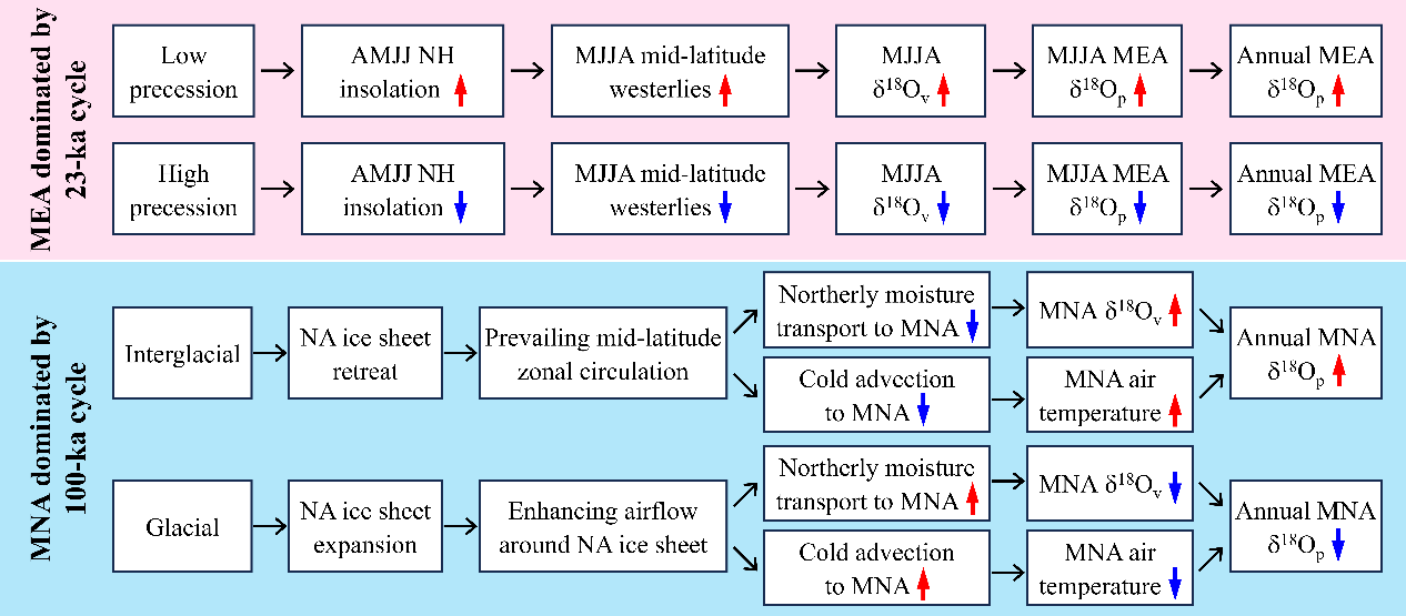 最近,中科院地球环境研究所博士生李媛媛及其导师刘晓东研究员等利用包含水同位素分馏过程的全球气候模式获得的过去30万年瞬变模拟结果,针对北半球中纬度地区,特别是分别位于东、西半球的中纬度东亚(MEA,120~135°E; 45~60°N)和北美(MNA,70~85°W; 40~55°N)两个代表区,系统研究了其降水氧同位素轨道尺度变化的周期特征和物理机制。结果表明,中纬度东亚与北美降水氧同位素变化的主导周期和强迫因子不同,而且涉及的物理过程也不一样。(1)虽然两个代表区年降水氧同位素比值(δ18O)都存在2.3万年、4.1万年和10万年周期,但MEA降水δ18O的主导周期为2.3万年,而MNA降水δ18O的主导周期为10万年(图1);(2)MEA降水δ18O的2.3万年主导周期是由岁差引起的太阳辐射变化驱动的,雨季(5-8月)西风环流的水汽输送是联系北半球太阳辐射(4-7月)与降水δ18O变化的关键过程;MNA降水δ18O的10万年主导周期受全球冰量起伏影响的冰期-间冰期循环控制,主要通过北美冰盖扩张与退缩引起的水汽输送改变及气温变化而实现(图2)。这些结果表明,北半球中纬度不同地区降水氧同位素轨道尺度变化的主导周期和强迫机制复杂多样。