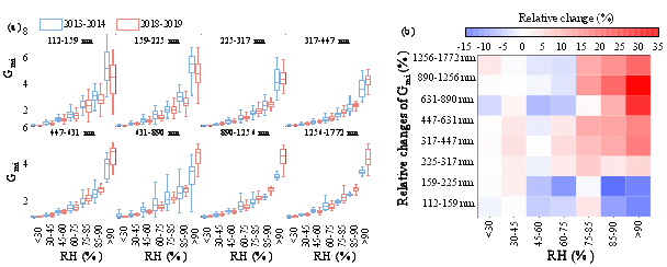 图1. 2013-2014和2018-2019西安冬季无机气溶胶吸湿性增长系数随粒径和湿度的变化情况