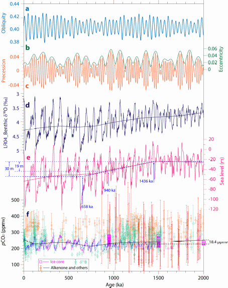 为验证太阳辐射量与长期气候变化的潜在关系,中国科学院地球环境研究所金章东研究员课题组联合国内多个专家,聚焦第四纪的长期降温趋势,从能量守恒的角度入手,结合古海学记录和模式模拟,开展了深入探索。该研究首先汇编了全球海水表层温度(SST),重建了过去2 Ma(百万年)的SST距平堆叠(stack)曲线。结果显示在2-0.94 Ma,全球平均SST下降了约2.34°C。在此期间,平均大气CO2仅下降约20 ppmv,已有研究也表明极地冰盖生长的正反馈过程(例如地表反照率增加等)也不足以驱动同期的长期降温,因此,显然需要有其他驱动机制来充分揭示第四纪的长期降温演变。