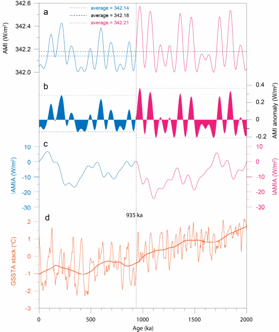 为了量化入射太阳辐射对气候的长期影响,该研究引入了一个新的指数——年平均太阳辐射量距平积分(IAMIA),它反映了在特定时间段内,年平均太阳辐射量(AMI)与其“正常”周期之间的累积偏移量。研究发现,IAMIA在935 ka(千年)发生了根本性转变,指示了太阳辐射量从之前的持续正异常转变为之后的持续负异常,这一转折与SST记录中观察到的“900-ka冷事件”相吻合。此外,2000-935 ka的IAMIA持续减小,与同期全球SST的降低一致。基于斯特藩-玻尔兹曼定律的理论计算以及模式模拟结果,支持了太阳辐射的持续微小变化可能通过海洋热含量(OHC)的累积效应,驱动第四纪的长期降温趋势,从而为两半球冰盖在第四纪快速生长提供了先决条件,也为中更新世气候转型(MPT)的发生提供了有利条件。