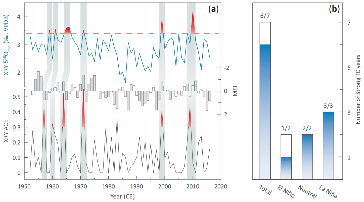 近期,中国科学院地球环境研究所极端气候事件及影响(EXCEIS)团队谭亮成研究员等利用采自广东省阳山县,距离海岸线300公里的仙人岩(XRY)洞穴年纹层石笋,获取了1951至2018年季节分辨率的δ18O记录。结合现代观测资料与模拟数据,分析XRY δ18O的古气候意义,探究其中的热带气旋活动信号。结果表明:在年际尺度上,XRY δ18O主要受厄尔尼诺-南方涛动(ENSO)调制的降水季节性控制。在热带气旋活跃的年份,气旋降水的负异常δ18O信号叠加在夏季风期间偏负的背景降水δ18O信号上,导致XRYδ18O明显更为偏负。研究提出年内最小XRY δ18O值可作为识别热带气旋活跃年份的可靠指标,利用该指标对当地60余年来的热带气旋活跃年份进行识别。通过和器测记录的对比,显示识别正确率为86%。