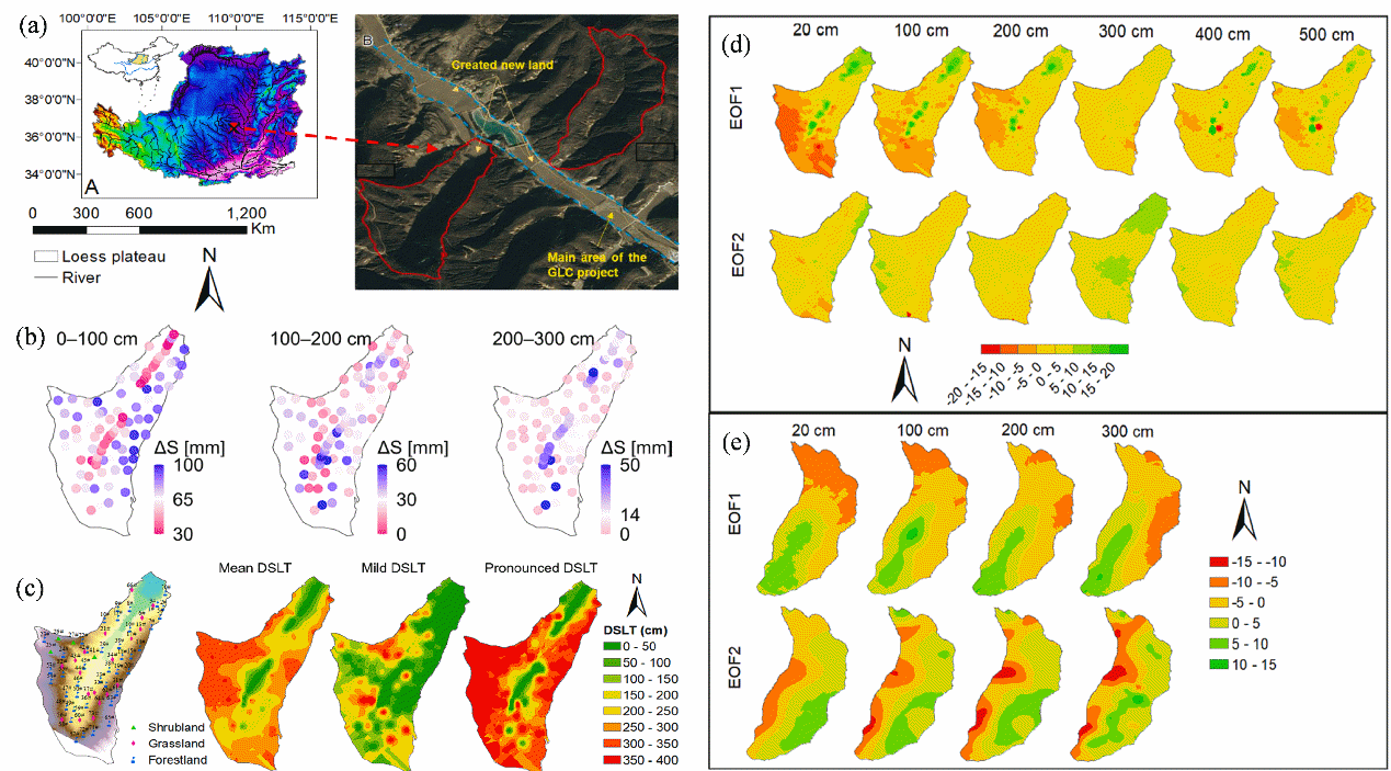 图1 顾屯小流域空间分布及相对位置(a);小流域不同深度年土壤水分储量变化量的空间格局(b);小流域不同土地利用方式下平均土壤干层厚度的空间格局(c);治沟造地小流域EOF1和EOF2的空间格局(d);未治沟造地小流域EOF1和EOF2的空间格局(e)。