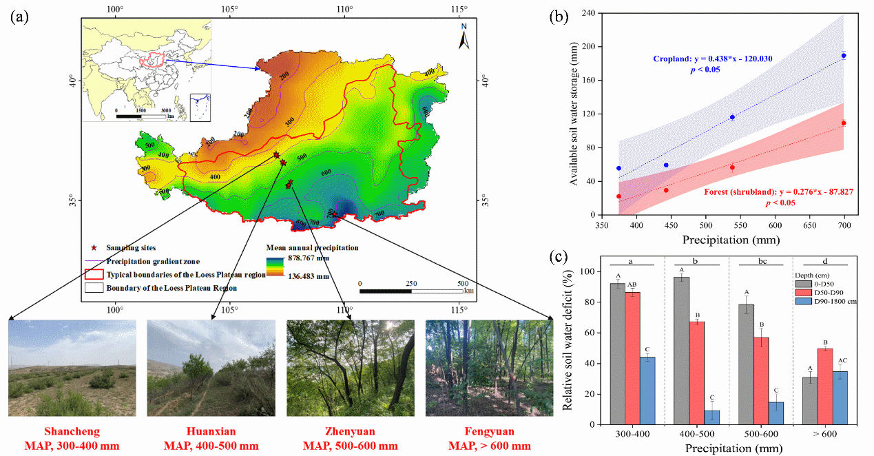地球关键带涵盖了从植被冠层顶部到地下水底部的广泛区域,是由岩石圈、水圈、土壤圈、生物圈和大气圈构成的复杂系统,对维持陆地生态系统的运转和人类生存至关重要。黄土关键带是世界上的典型地球关键带之一。中国黄土高原是全球黄土分布最广、堆积最厚、记录地学信息最丰富的地区,因此成为全球黄土关键带研究的代表性区域。然而,该区域长期面临着土壤侵蚀、水土流失、生态环境脆弱等严峻问题。土壤水文过程深刻影响着该关键带中的物质迁移、水分循环、植被生长及一系列生物地球化学循环过程,是黄土关键带服务功能的关键控制过程之一。尽管已有大量研究关注黄土关键带土壤水文过程,但对于多尺度深剖面土壤水分的时空演化及其对区域气候变化、植被恢复等重大工程的响应与反馈等问题的理解仍然有限。鉴于此,王云强研究团队针对这些关键问题开展了深入研究,取得如下进展:
