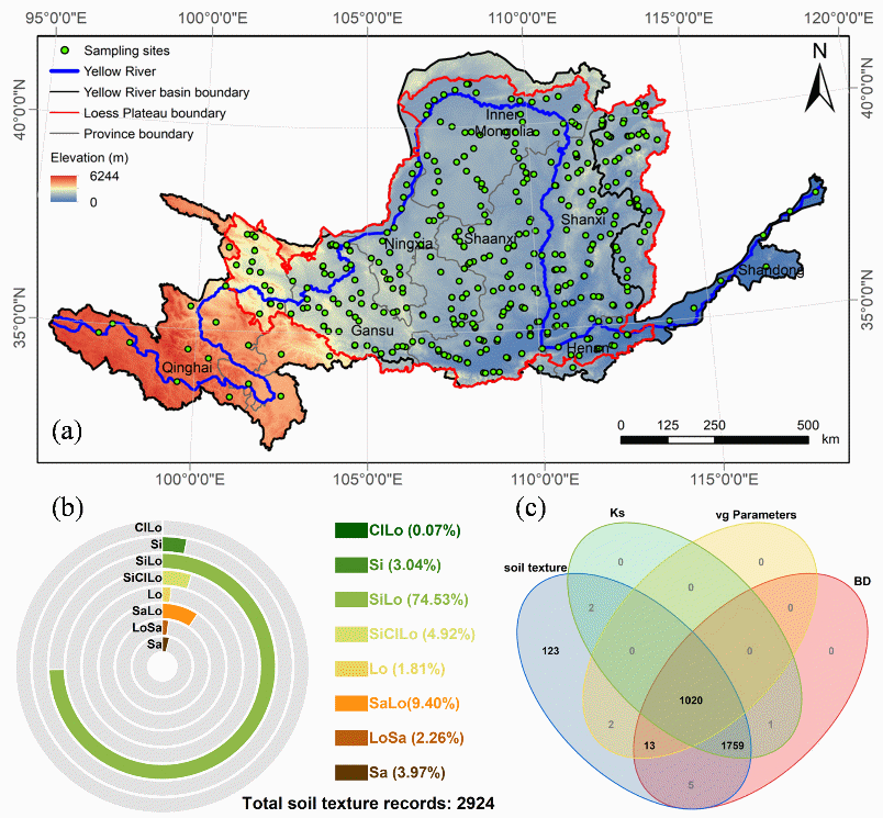 图3 黄河流域土壤水力参数数据库样点空间分布(a);数据库内不同土壤质地类型占比(b);数据库内不同类型土壤水力参数数量(c)。