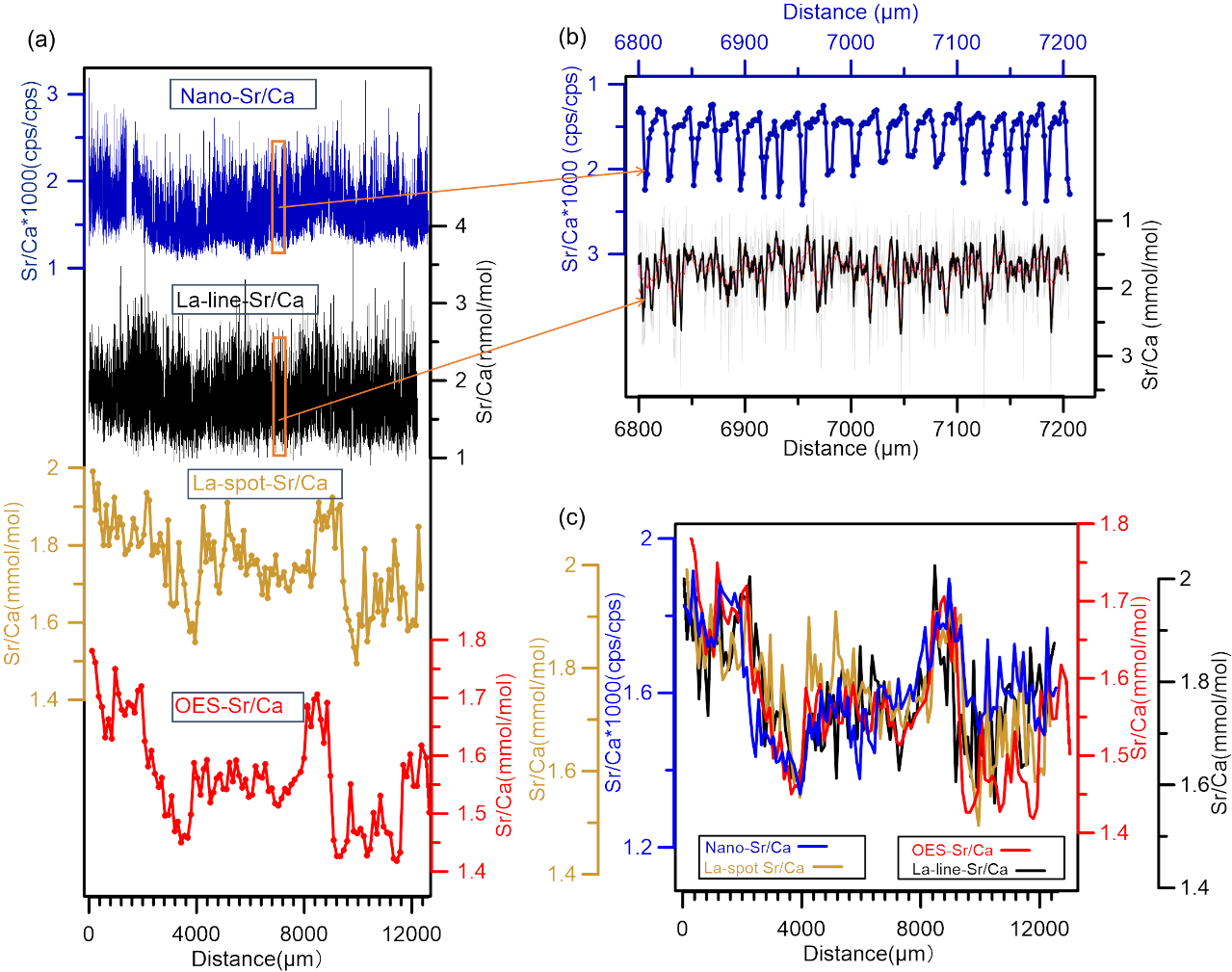 1:不同测试分析方法获得的砗磲Sr/Ca在月尺度上具有较好的一致性,NanoSIMS获取的砗磲小时Sr/Ca具有良好的天周期循环特征。