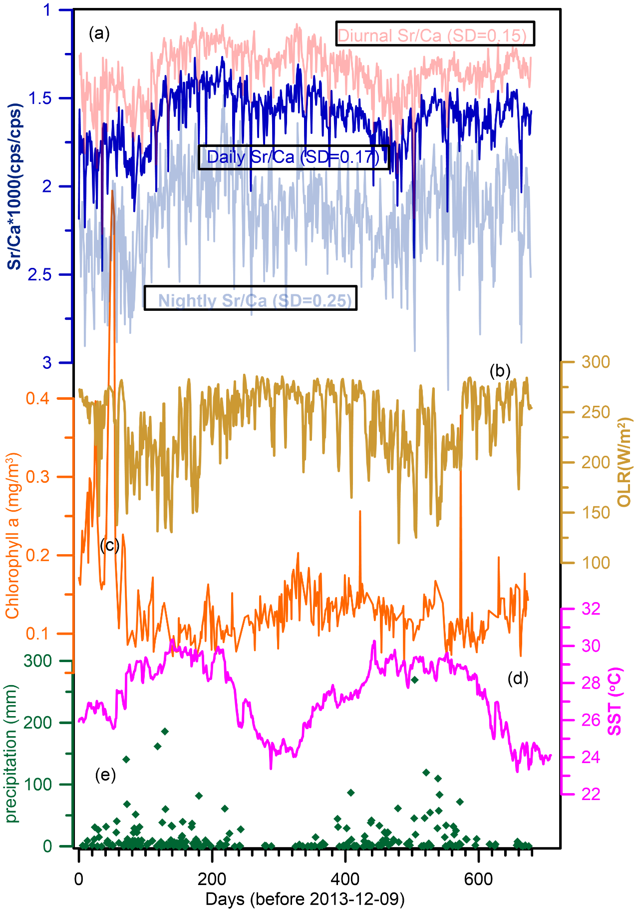 2:砗磲小时-天分辨率Sr/Ca与各气候、环境因子的对比分析