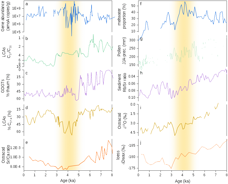 研究结果显示,青藏高原东北部在中-晚全新世过渡期间曾出现过一次持续1500年的融水事件。该事件和亚洲内陆多地5-3ka间的大幅增温事件同步,因此局地的异常升温可能是该融水事件的主要原因。融水事件中,湖泊藻类和细菌的种群和生物量也发生了剧烈波动,显示融水增加对区域生态产生过强烈影响(图3)。同时,青藏高原至中亚的很多区域的水同位素记录在3-5ka间都呈现阶段性的偏负,这与低纬地区降水同位素记录有所不同。因此我们推测,作为中-晚全新世过渡期间亚洲内陆气候系统重组的结果,该融水事件可能普遍存在于亚洲内陆的冰川冻土区。