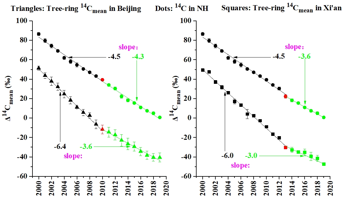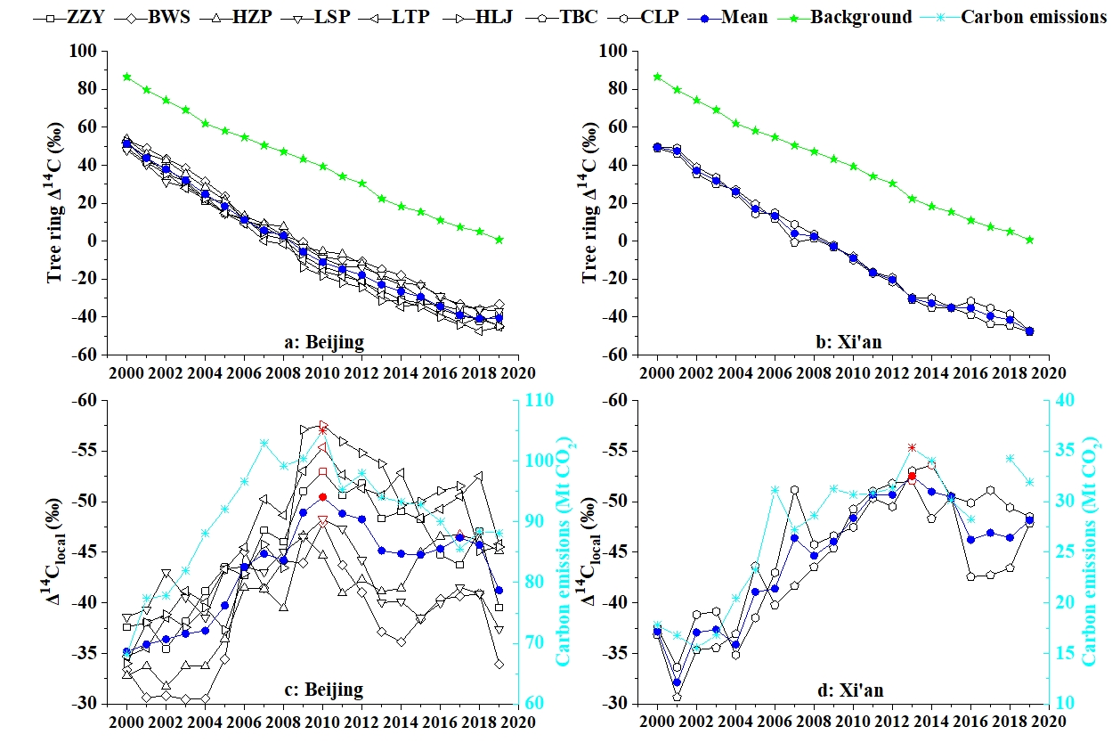 中国科学院地球环境研究所牛振川研究员和团队利用北京和西安市树轮Δ14C近20年序列的年际变化,通过扣除本底14C的影响,发现北京市当地Δ14C的最低值在2010年,西安市当地Δ14C的最低值在2013年,这与统计数据显示的北京市和西安市的碳达峰时间相吻合。此外,该研究还通过分析树轮Δ14C年际差变化的转折点,进一步确定了碳达峰时间,也与清单的碳达峰时间相吻合。这些吻合表明了此方法的可行性。