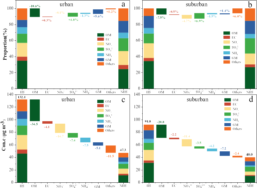 1. 采暖季(HS)与非采暖季(NHSPM2.5化学组分贡献(ab)与浓度变化(cd