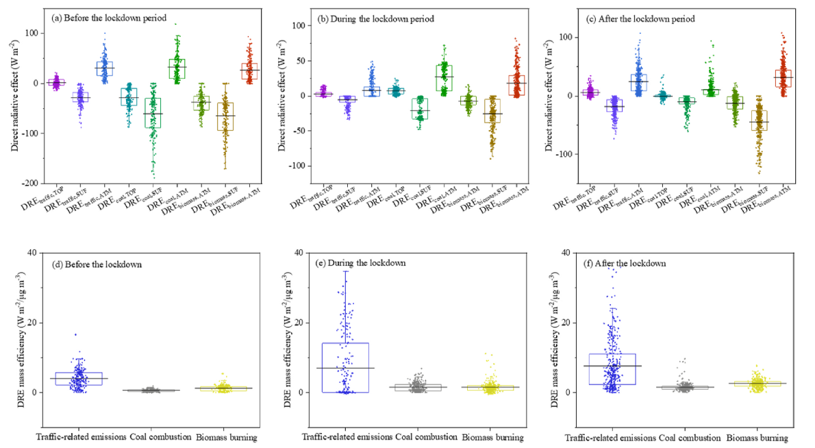 4. PM2.5不同源直接辐射强迫和直接辐射强迫效率:交通源(ad)、燃煤源(be)和生物质燃烧源(cf)